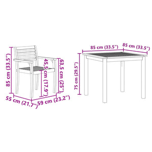 Este conjunto de jantar rústico é lindo e vem com uma mesa de madeira de acácia maciça, perfeita para momentos inesquecíveis de refeições ao ar livre. O tamanho generoso da mesa de 110x110 cm oferece muito espaço para refeições, jogos ou saborear um vinho, servindo como um ponto central no jardim, pátio ou terraço.
