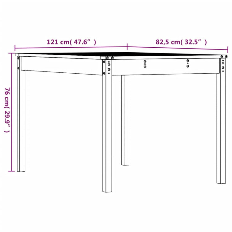 - Madeira de pinho maciça: a mesa de exterior é feita em madeira de pinho maciça. A madeira de pinho maciça é um bonito material natural. A madeira de pinho possui um grão reto e os nós conferem ao material o seu aspeto rústico.