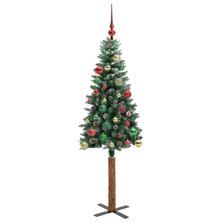 - Decorativo com pinhas e bolas ornamentais, Pontas de galho realistas com neve congelada, Tronco de madeira real