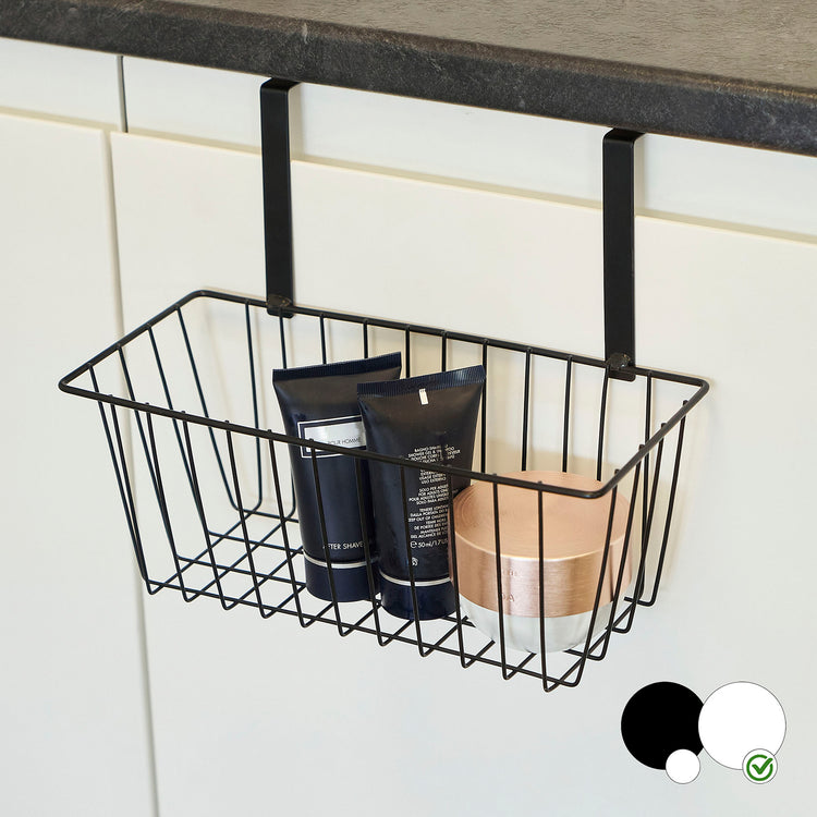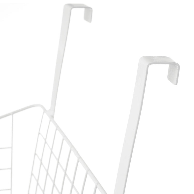 Metal: hierro lacado con tratamiento antioxidante. Soporta 5 kg de peso. Tamaño de la cesta: 28x12,50x11 cm. Medida gancho: 1,5x2,5x10,5 cm.