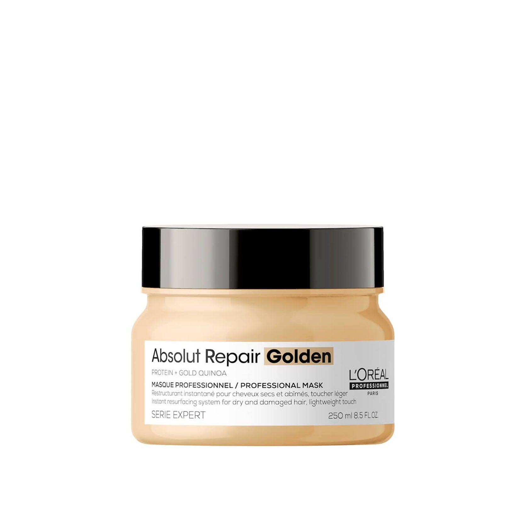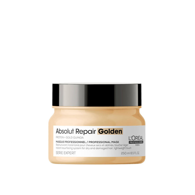 Mascarilla dorada de reconstrucción instantánea para cabellos muy dañados, a base de proteína dorada. Gel crema. Resultados: Profunda acción reparadora de la fibra capilar pero con un tacto suave, ligero y natural. El interior de la fibra capilar se reestructura y repara, dejando el cabello más fuerte, y su superficie queda protegida de todas las agresiones.