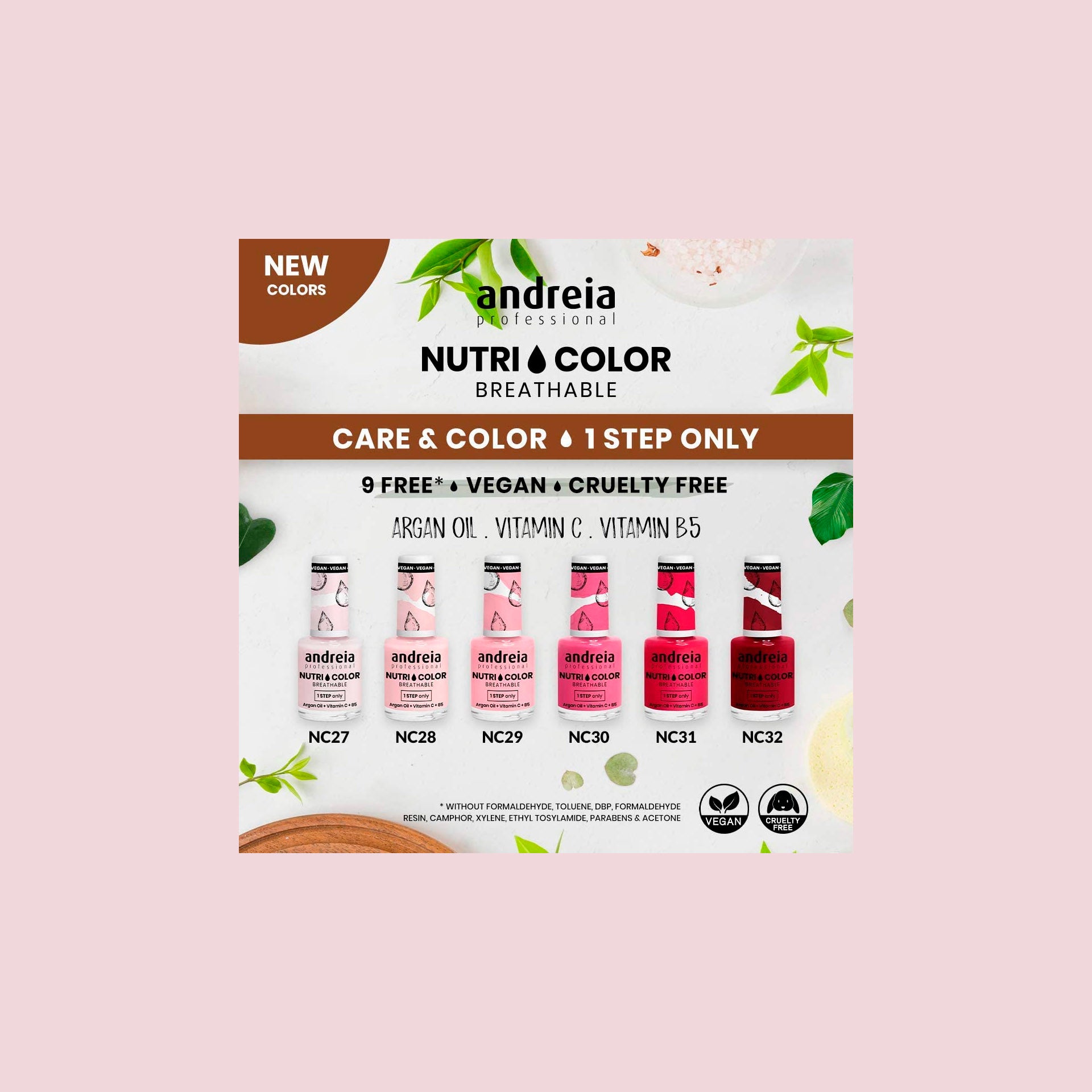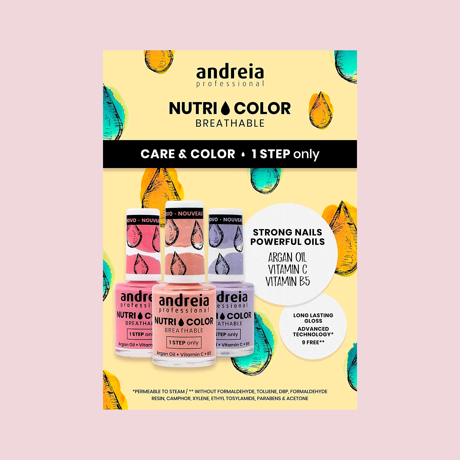 Se trata de una gama de esmaltes de uñas que combina Care + Color en un solo frasco. Tiene tonos super trendy con una formulación enriquecida con Aceite de Argán, Vitamina C y B5. Brinda un acabado brillante de larga duración, 9 Free* (libre de formaldehído, tolueno, dbp, resina de formaldehído, alcanfor, xileno, etil tosilamida, parabenos y acetona) y tecnología avanzada (permeable al vapor de agua). Con esta gama podrás fortalecer y nutrir tus uñas sin prescindir del color. Ideal para quienes quieren tomarse un descanso del esmalte en gel sin prescindir del color.