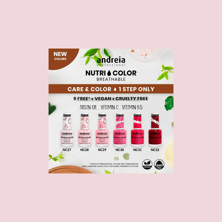 Modo de empleo: Seguir el procedimiento normal para una manicura y al final poner Barniz Andreia Nutricolor en 2 capas y sellar las puntas.