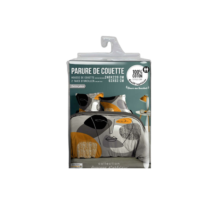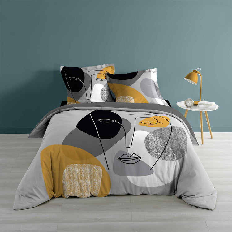 Juego de cama de matrimonio, perfecto para los siguientes colchones: 140x190, 140x200, 150x190, 150x200. Funda nórdica y 2 fundas de almohada. Composición: 100% algodón. Tejido: 57 hilos/cm2. Colores: el frente, sus formas geométricas y el estampado minimalista de la cara sobre un hermoso fondo gris le dan a esta colcha un lado chic y elegante, lo que le permite encajar fácilmente en muchos estilos de decoración. En la parte posterior, la cara es lisa en gris para un poco más de sobriedad. Una verdadera invitación a soñar, un mundo de elegancia y encanto. Sublima su decoración interior en un abrir y cerrar de ojos. Funda nórdica con cierre de muelles. 2 fundas de almohada a juego 63x63 cm. Cuidados: lavable a máquina a 40°C, prohibido blanquear, secadora, planchado a temperatura media (150°C), lavado en seco prohibido. Le recomendamos que lave su juego antes del primer uso para garantizar una suavidad óptima.