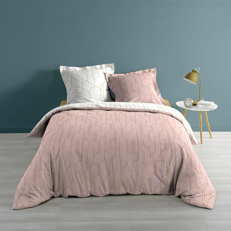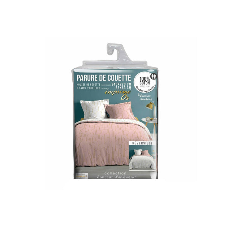 Juego de cama de matrimonio, perfecto para los siguientes colchones: 140x190, 140x200, 150x190, 150x200. Funda nórdica y 2 fundas de almohada. Composición: 100% algodón. Tejido: 57 hilos/cm2. Colores: rosa y dorado, estampado art déco dorado, reversible. Sublima su decoración interior en un abrir y cerrar de ojos. Funda nórdica con cierre de muelles. 2 fundas de almohada a juego 63x63 cm. Cuidados: lavable a máquina a 40°C, prohibido blanquear, secadora, planchado a temperatura media (150°C), lavado en seco prohibido. Le recomendamos que lave su juego antes del primer uso para garantizar una suavidad óptima.
