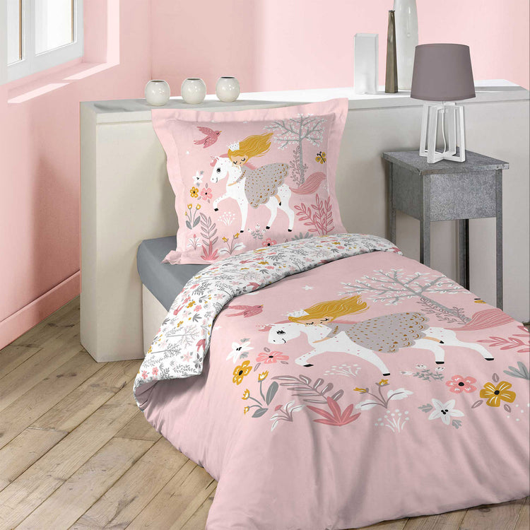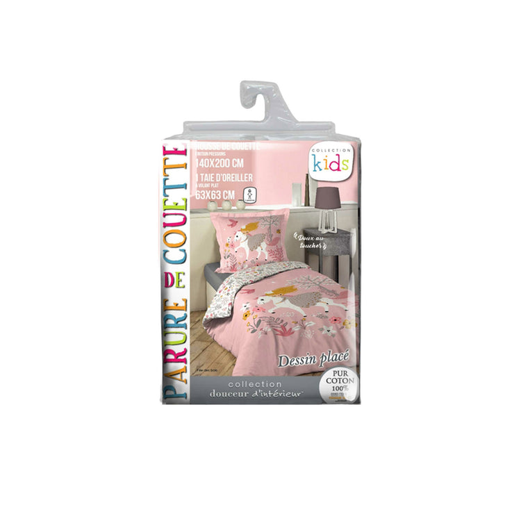 Estampa mágica que representa a una pequeña hada y su unicornio en un entorno rural. ¡Reversible, este conjunto se adapta a los deseos de tu hijo! Composición: 100% algodón. Tejido: 42 hilos/cm2. Funda nórdica con cierre a presión 1 funda de almohada 63x63 cm. Consejos de cuidado para tu juego de cama: lavable a máquina a 40°c, prohibido blanquear, secadora, planchar a temperatura media (150°c), lavado en seco prohibido. Le recomendamos que lave su juego antes del primer uso para garantizar una suavidad óptima.
