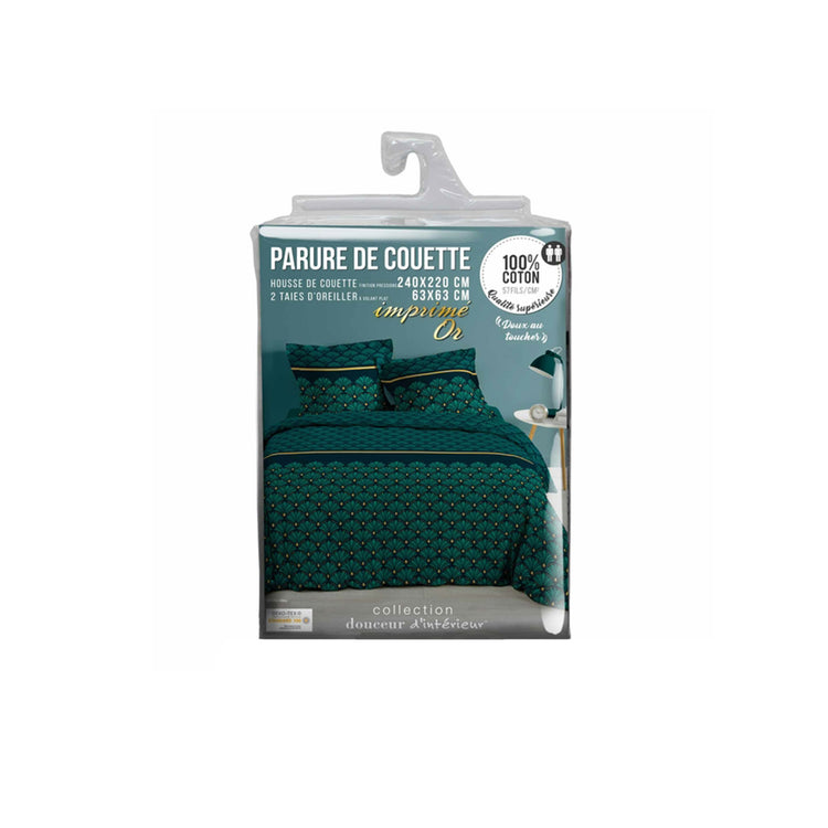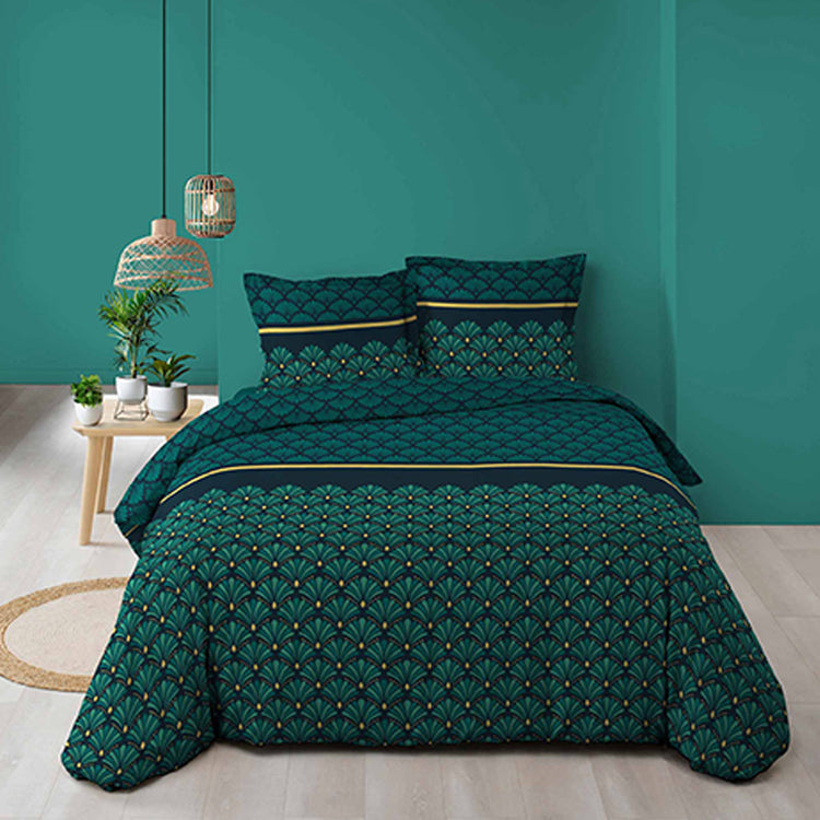 El estampado art déco del juego de cama artchic forma parte de un estilo actual y actual que se adapta fácilmente a todos los ambientes del dormitorio. Composición: 100% algodón. Tejido: 57 hilos/cm2. Color verde; impresión art déco. Funda nórdica con cierre a presión 2 fundas de almohada a juego 63x63 cm. Lavable a máquina a 40°C, prohibido blanquear, secadora, planchado a temperatura media (150°c), lavado en seco prohibido. Le recomendamos que lave su juego antes del primer uso para garantizar una suavidad óptima.