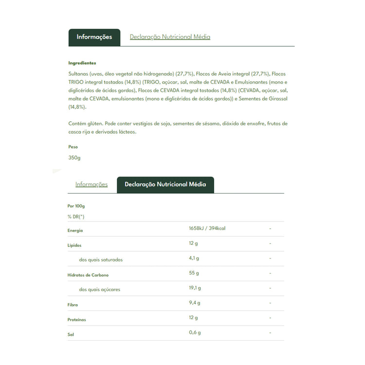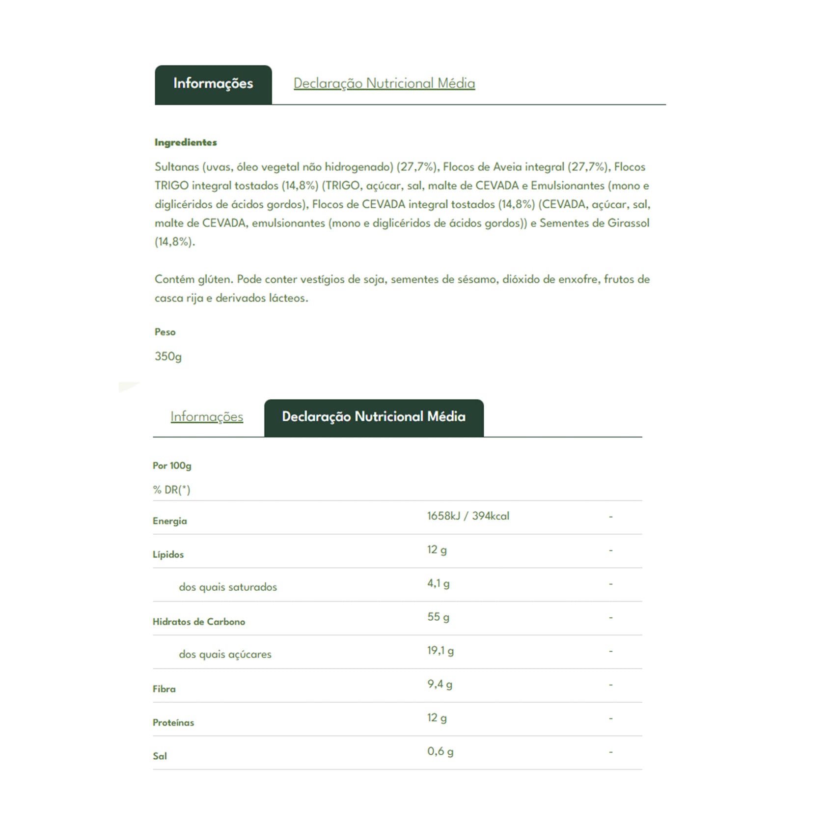 Feita à base de cereais integrais de aveia, trigo e cevada, esta mistura é muito nutritiva e pode ser consumida por qualquer pessoa saudável. O máximo valor nutritivo é alcançado através da mistura de cereais a que se adicionaram sultanas e amendoins. O cereal mix integral que, geralmente, se prepara com leite, tem a valiosíssima característica de compensar a insuficiência dos cereais em cálcio e vitaminas A e D. Nesta mistura, os cereais complementam-se para originar uma proteína vegetal e a sua combinação colmata a falta dos aminoácidos triptófano, cistina e lisina - fundamentais na formação da proteína - em cada um dos cereais separadamente. De preparação rápida com leite, a mistura constitui uma importante fonte de fibras, contribui para regular a função intestinal e ajuda à manutenção de um organismo naturalmente saudável.