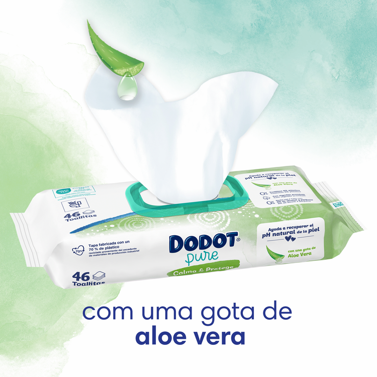 Cuidado delicado e proteção para a pele do seu bebé, com uma gota de Aloé Vera. As toalhitas Dodot Pure Acalma e Protege são mais suaves do que o algodão e a água.