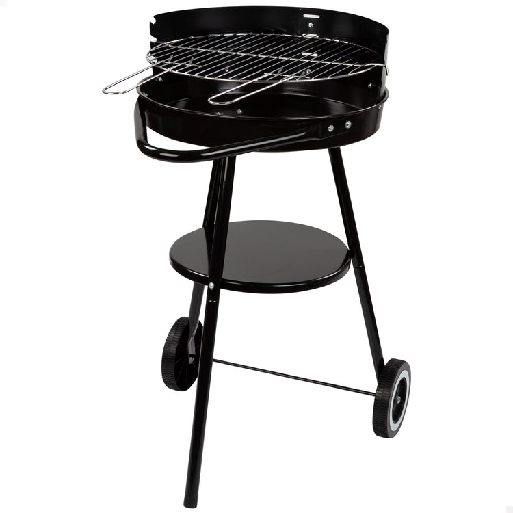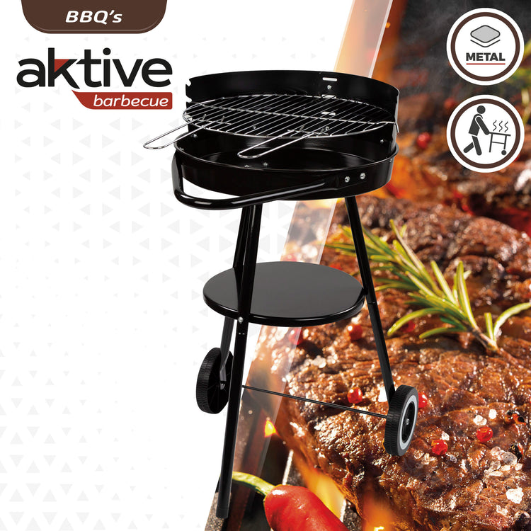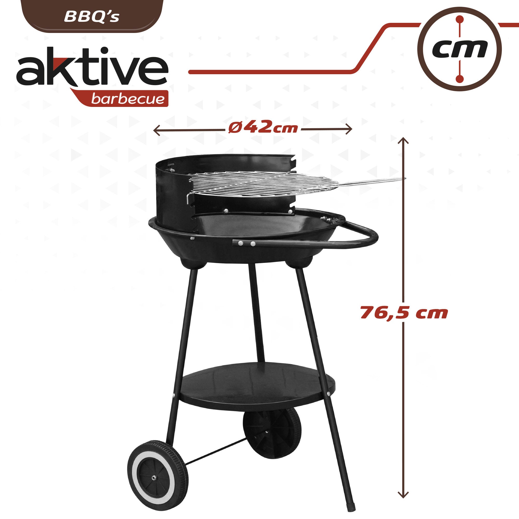 Churrasqueira a carvão portátil Aktive. Fabricado em metal esmaltado preto Ø42x77 cm. Com estrutura metálica com 3 pés (1 fixo e 2 rodas) e superfície auxiliar. Incorpora uma grelha com duas pegas amovíveis e o barbecue tem 3 alturas para colocar a grelha mais ou menos perto das brasas. Leve e com uma pega de transporte frontal para facilitar a sua deslocação. Fácil e rápido de montar (necessita de ferramentas).