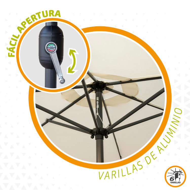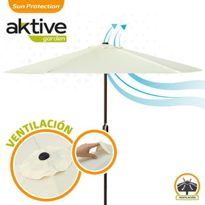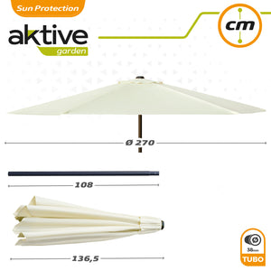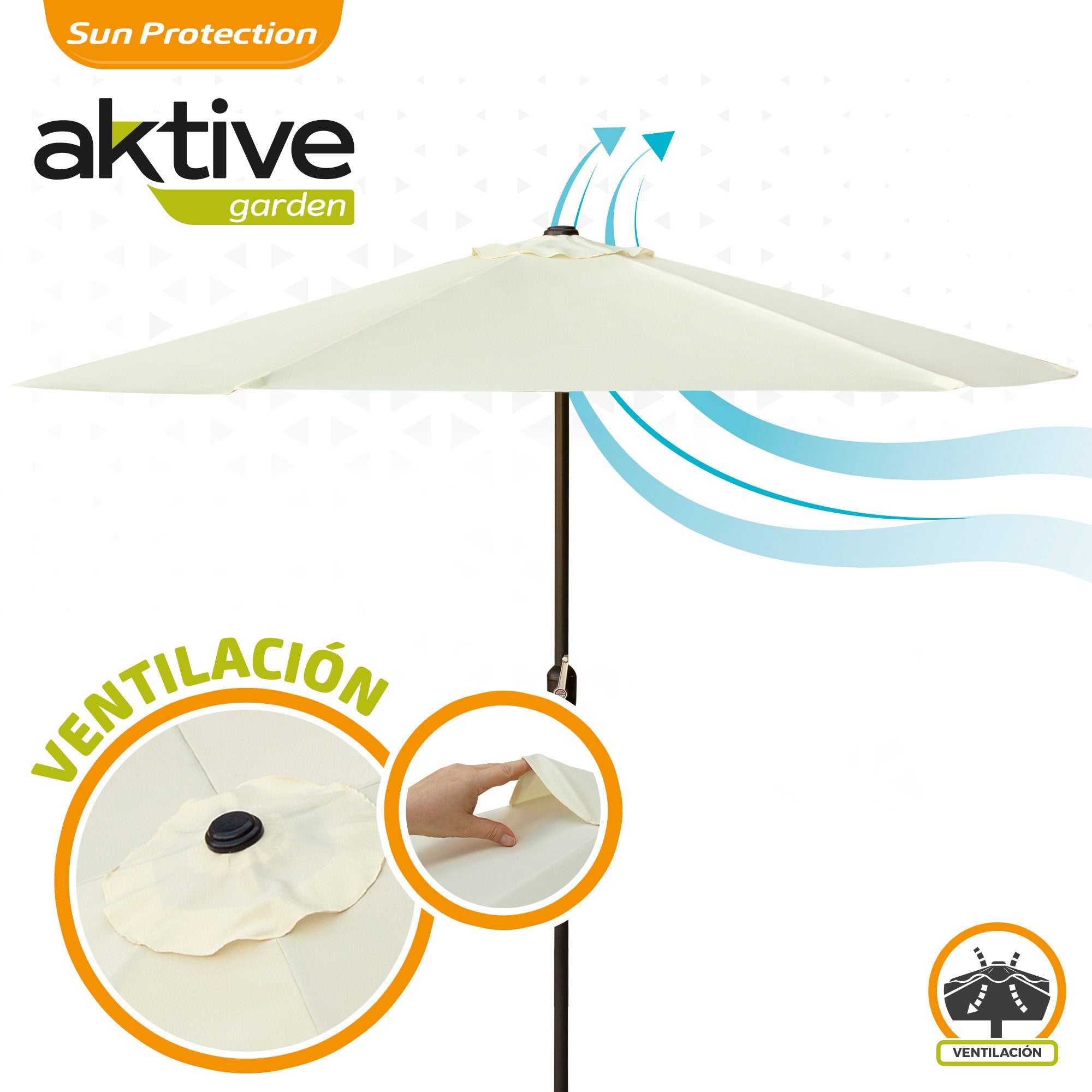 Guarda-sol hexagonal de jardim Aktive Garden na cor creme. Estrutura de alumínio formada por 6 hastes e um mastro para guiar a sombra de 38 mm de diâmetro. O guarda-sol mede 270 cm e é feito de poliéster 150 gr/m2. Sistema de abertura e fechamento com manivela manual. O teto do guarda-sol é aberto e duplo para promover a circulação de ar e torná-lo mais estável em condições de vento.
