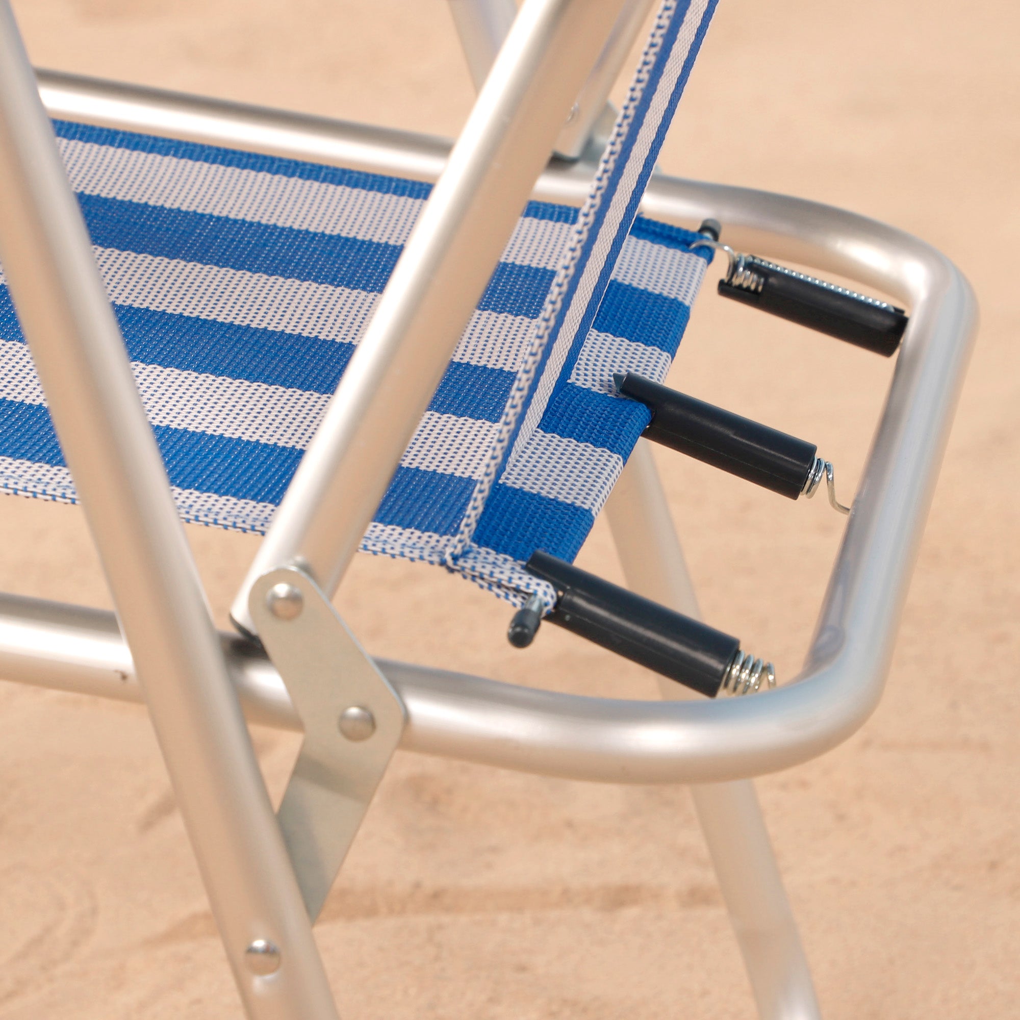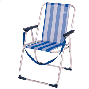 Cadeira alta com posição fixa dobrável de Aktive Beach. Assento prático com apoios de braços ergonómicos para desfrutar do ar livre. É dobrável e se transforma em uma bolsa confortável graças à alça embutida. Medidas abertas: 44x45x76 cm; dobrado: 53x6x68 cm. Altura do assento de 39 cm e o encosto tem 44 cm de largura. Feito de alumínio e textileno, resistente e impermeável com design de listras de marinheiro azul e branco. Ideal para praia, piscina ou camping.