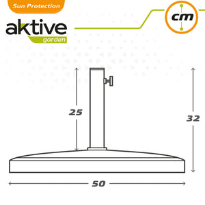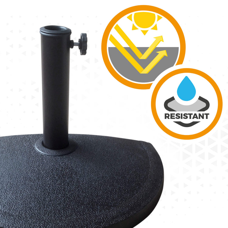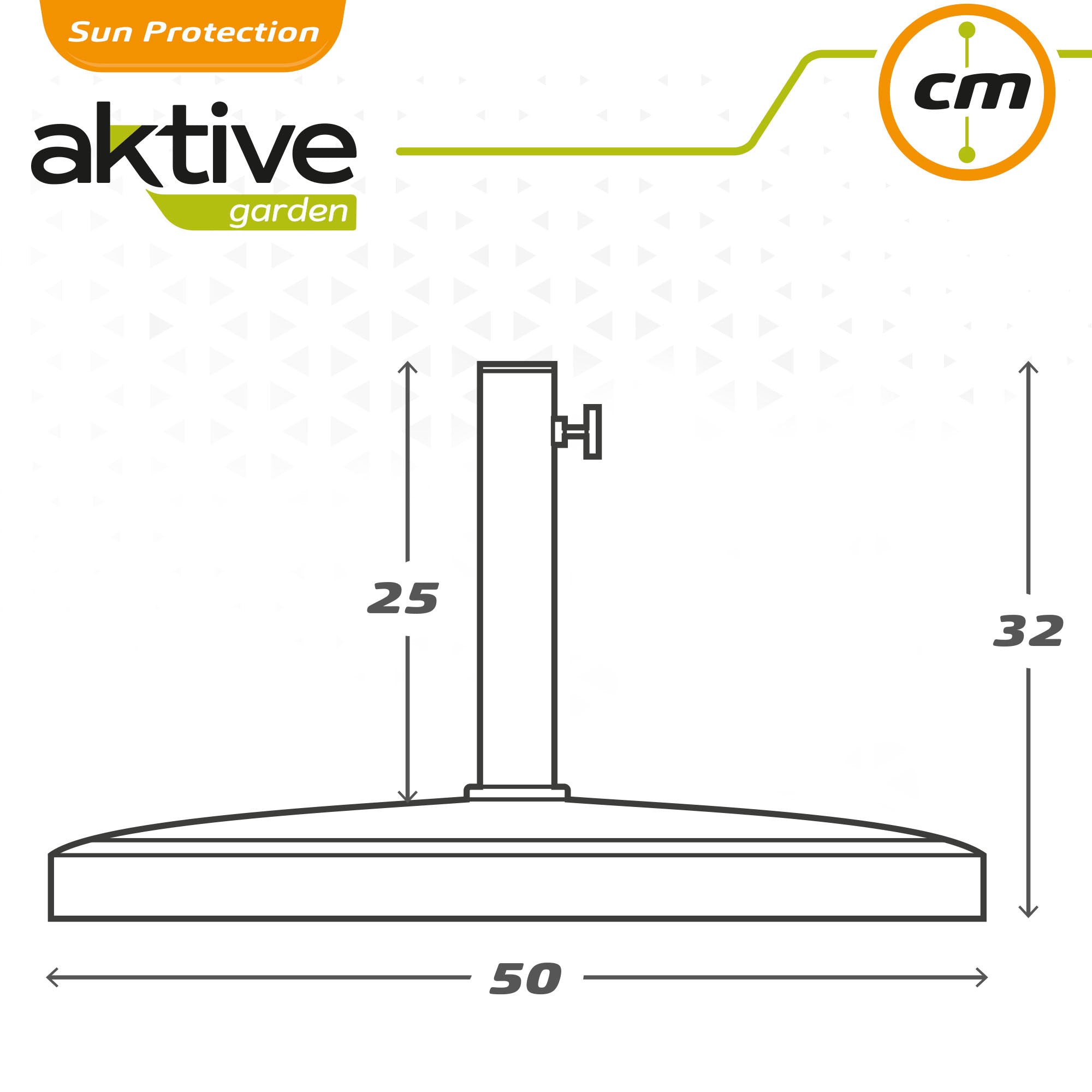 Suporte de guarda-sol semicircular Aktive Garden feito de polyresin com um diâmetro de 50 cm e uma altura de 32 cm. A peça pesa 9 quilos. Desenho funcional em preto com tubo de aço. Feito de material resistente à água e à luz solar. Ideal para assegurar a estabilidade e o apoio do seu guarda-sol contra o vento. Adequado para guarda-chuvas com haste de 38 e 48 mm, com fio ajustável.
