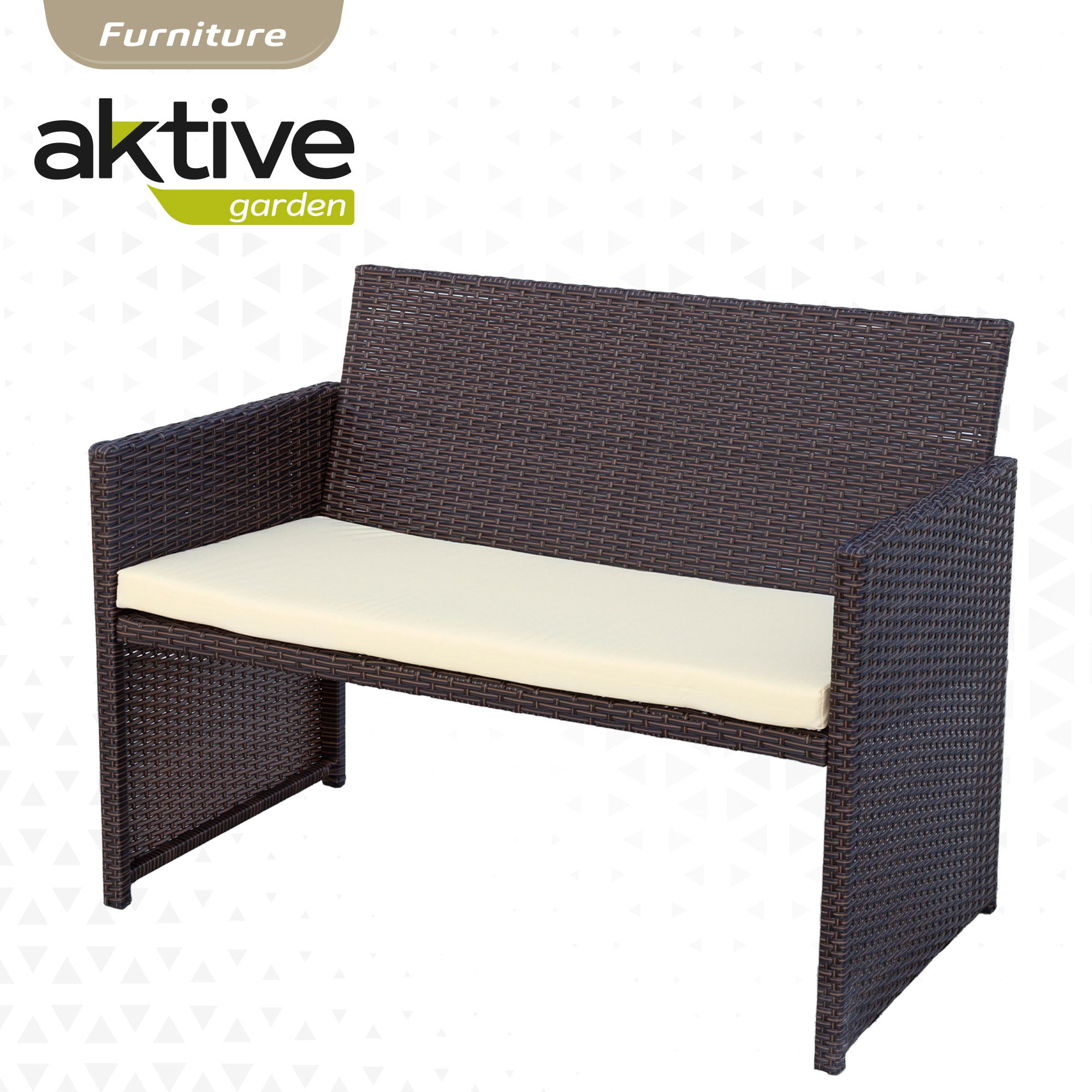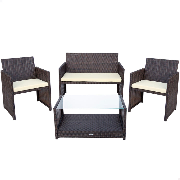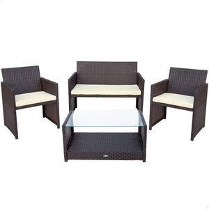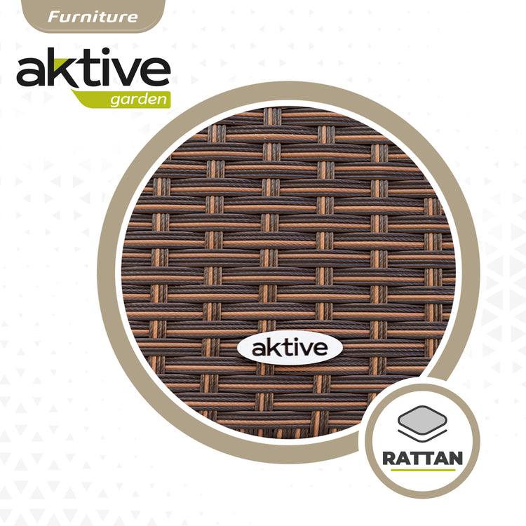 Conjunto de móveis de jardim Aktive Garden composto por duas poltronas, um sofá e uma mesa central. Tanto as cadeiras como a mesa são feitas de vime sintético, um material fácil de limpar e resistente à água e às intempéries. Para maior conforto e facilidade de uso, tanto as poltronas quanto o sofá incluem uma almofada acolchoada na cor creme (poliéster 180 gramas) e a mesa de centro possui um tampo de vidro para facilitar a limpeza e uma prateleira inferior. Cada poltrona mede 59 cm de largura, 59 cm de comprimento e 76 cm de altura; o sofá mede 108 cm de largura, 59 cm de comprimento e 76 cm de altura; A mesa mede 81 cm de largura, 45 cm de comprimento e 41 cm de altura. Conjunto ideal para uso em ambientes internos e externos.