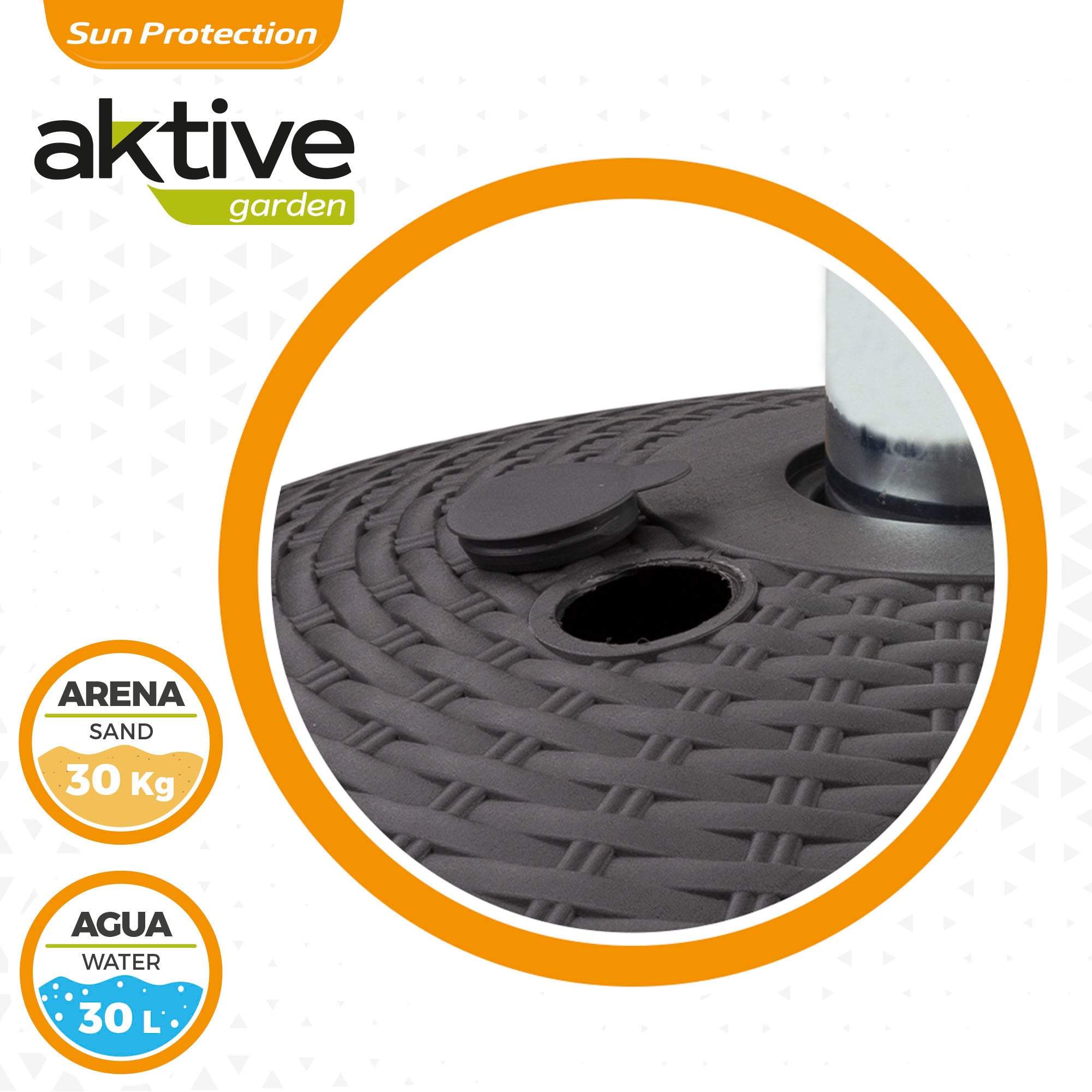 Suporte para guarda-chuvas Aktive Garden em forma circular. Tem um desenho simples e elegante de cor antracite decorado com relevo. Mede Ø58 x 41 cm e é perfeito para guarda-chuvas com um diâmetro de pólo de 41 a 51 milímetros, uma vez que o tubo tem um cabo de metal para ajustar o tamanho. A parte do tanque é feita de polyresin, um material leve, resistente à água e à luz solar, e o tubo é feito de polipropileno coberto com tubos metálicos de aço inoxidável. A base do guarda-sol tem um tanque com tampa que pode ser enchido com água (30 l) ou areia (30 kg). Ideal para assegurar a estabilidade e apoio do seu guarda-sol contra o vento e ao mesmo tempo para decorar o seu jardim ou terraço.