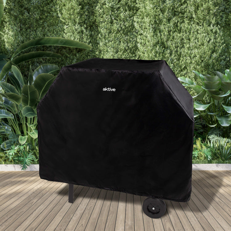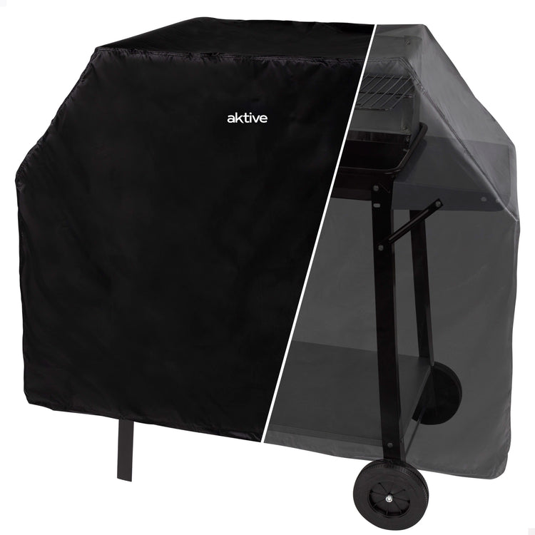 Cobertura para churrasqueira preta Aktive Barbecue. Mede 142x60x120 cm e é confeccionada em poliéster, um material resistente e durável, capaz de suportar a exposição às intempéries sem se desgastar com facilidade. Além disso, o poliéster é um material impermeável, o que ajuda a manter sua churrasqueira seca e livre de mofo. A cobertura incorpora uma corda de fixação que se ajusta ao barbecue para evitar que este deslize em dias de vento forte. Inclui um saco para dobrar e guardar a capa quando não estiver a ser utilizada.