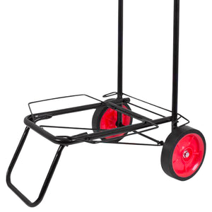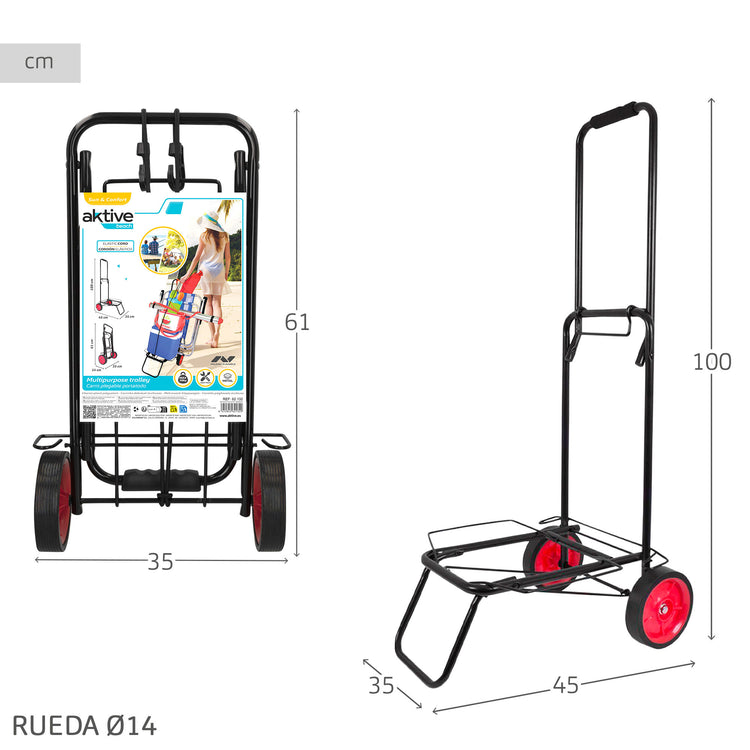 Carrinho dobrável multiuso Aktive Beach. O carrinho mede 35x14x61 cm dobrado e 35x45x100 cm aberto, é ideal para transportar guarda-chuva, cadeiras, geladeira e bolsa de praia sem carregar peso. Suporta até 50 kg. Com duas rodas de borracha e eixo central em ferro, fáceis de manusear mesmo na areia da praia. Inclui tira elástica com gancho duplo para fixar os objetos. Estrutura de metal.