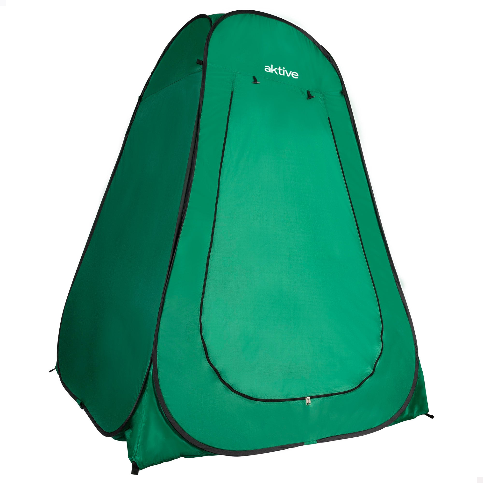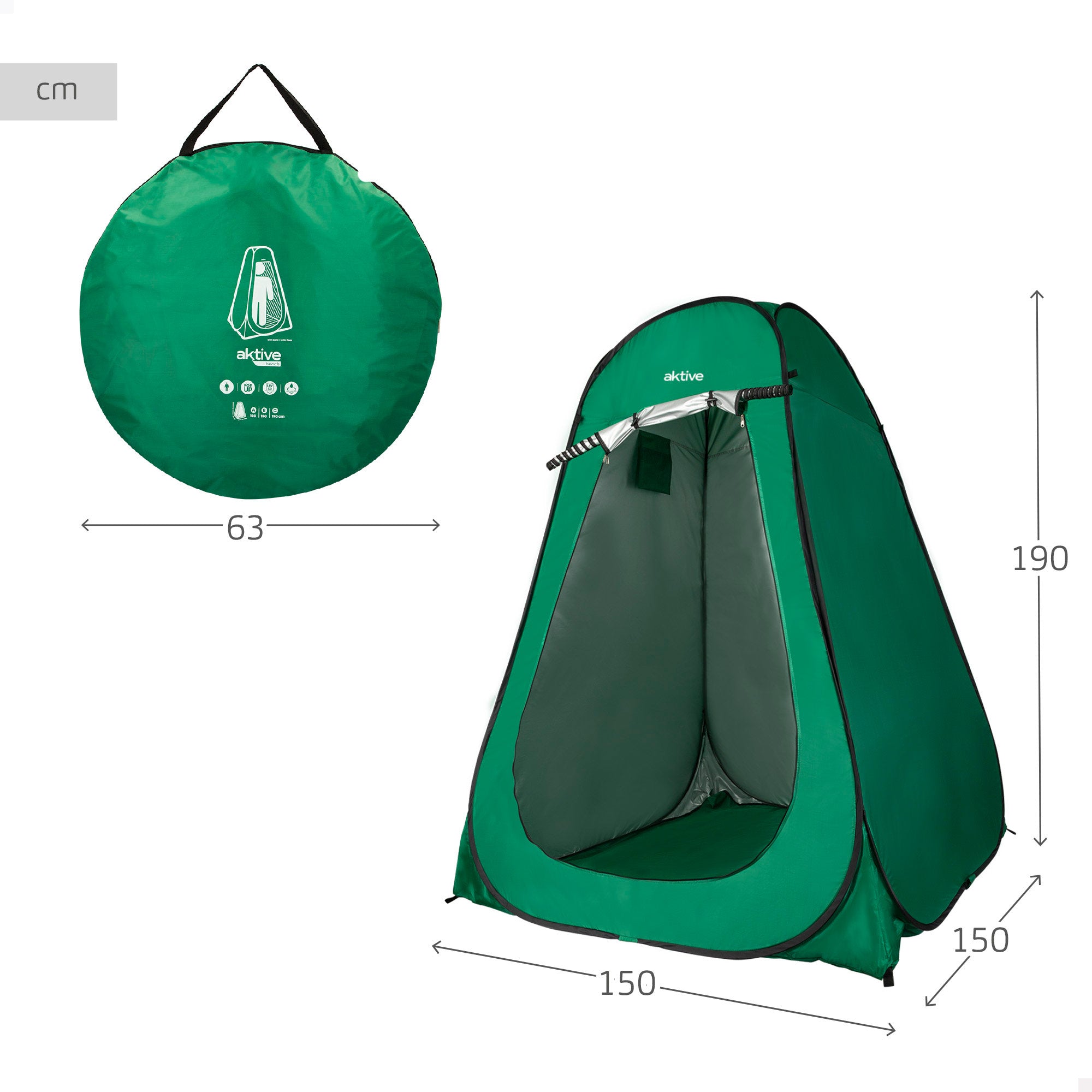 Tapete de mudança portátil verde para camping, praia ou montanha Aktive Beach. Mede 150x150x190 cm e é feito de poliéster 170T de alta qualidade. Com forro interno prateado e proteção UV50, a barraca possui bolso interno prático e porta de enrolar com duplo zíper. O trocador possui piso para maior conforto. Inclui 4 pinos e bolsa de transporte.