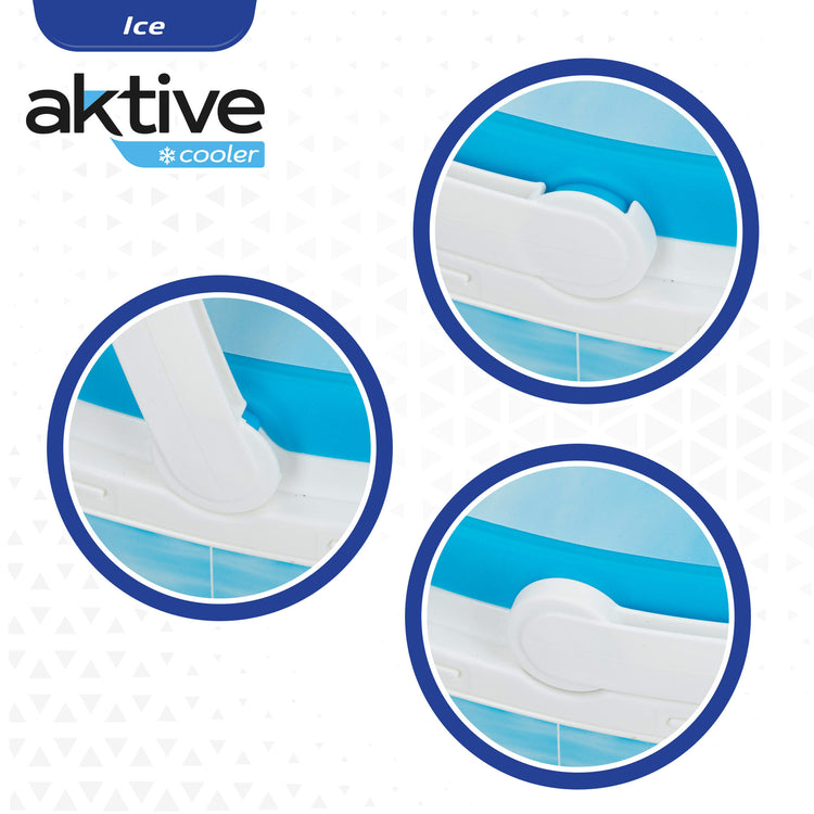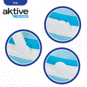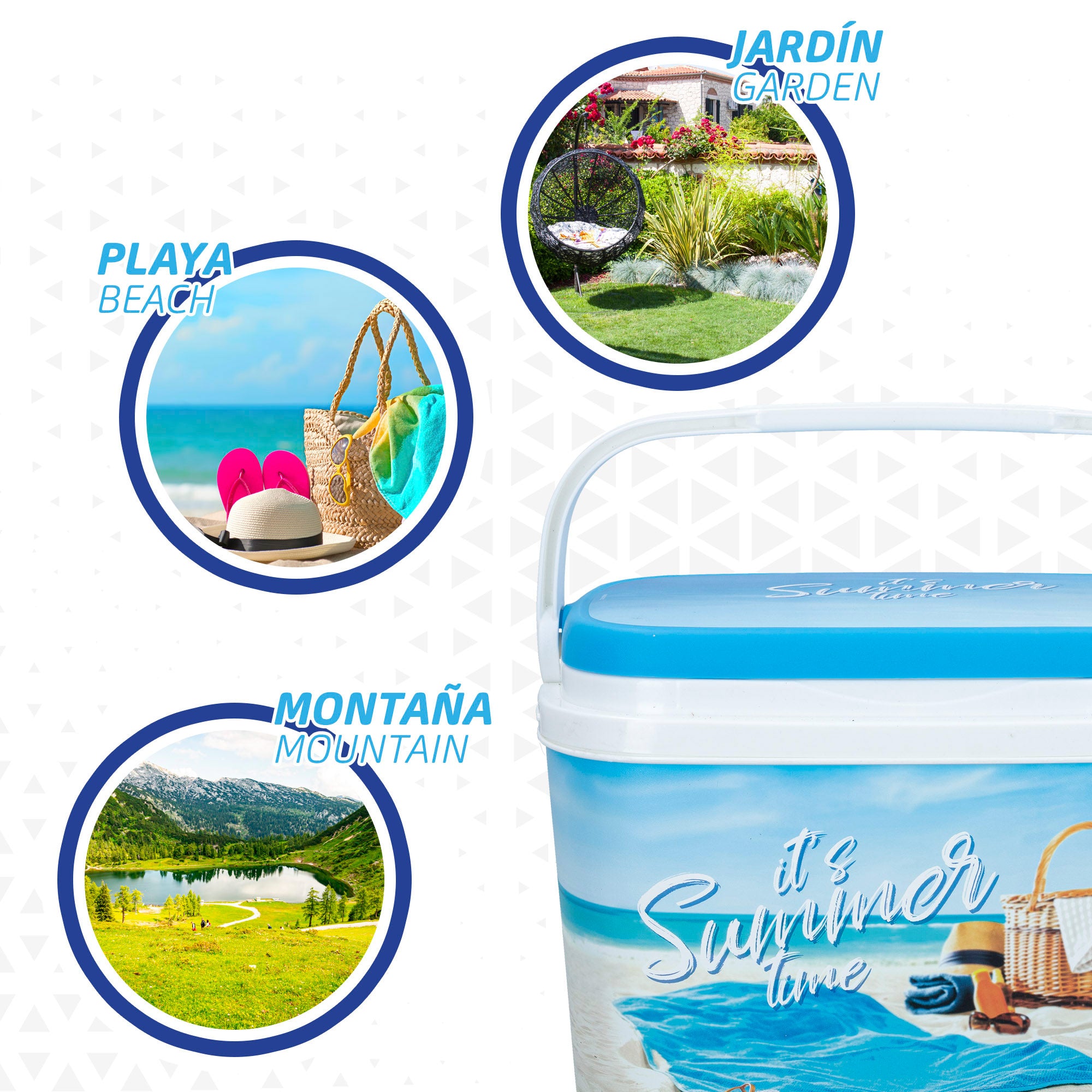 Mantenha a temperatura dos seus alimentos onde quer que vá com este frigorífico portátil da Aktive Cooler! É um refrigerador rígido com tampa e alça que, além de ser usado para transportá-lo, serve para ativar um sistema de fechamento ou abertura dependendo da posição em que é colocado. Tem capacidade para 6 litros e mede 29 cm de largura, 19 cm de comprimento e 20,5 cm de altura, um tamanho manejável e fácil de transportar para qualquer lugar. Tem um design atual e muito verão com uma ilustração de praia em tons de azul, branco e bege. Experimente com os coolers Aktive Cooler!