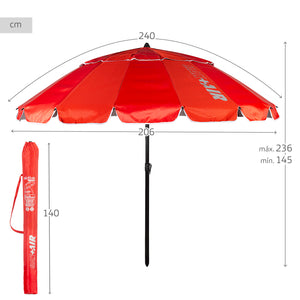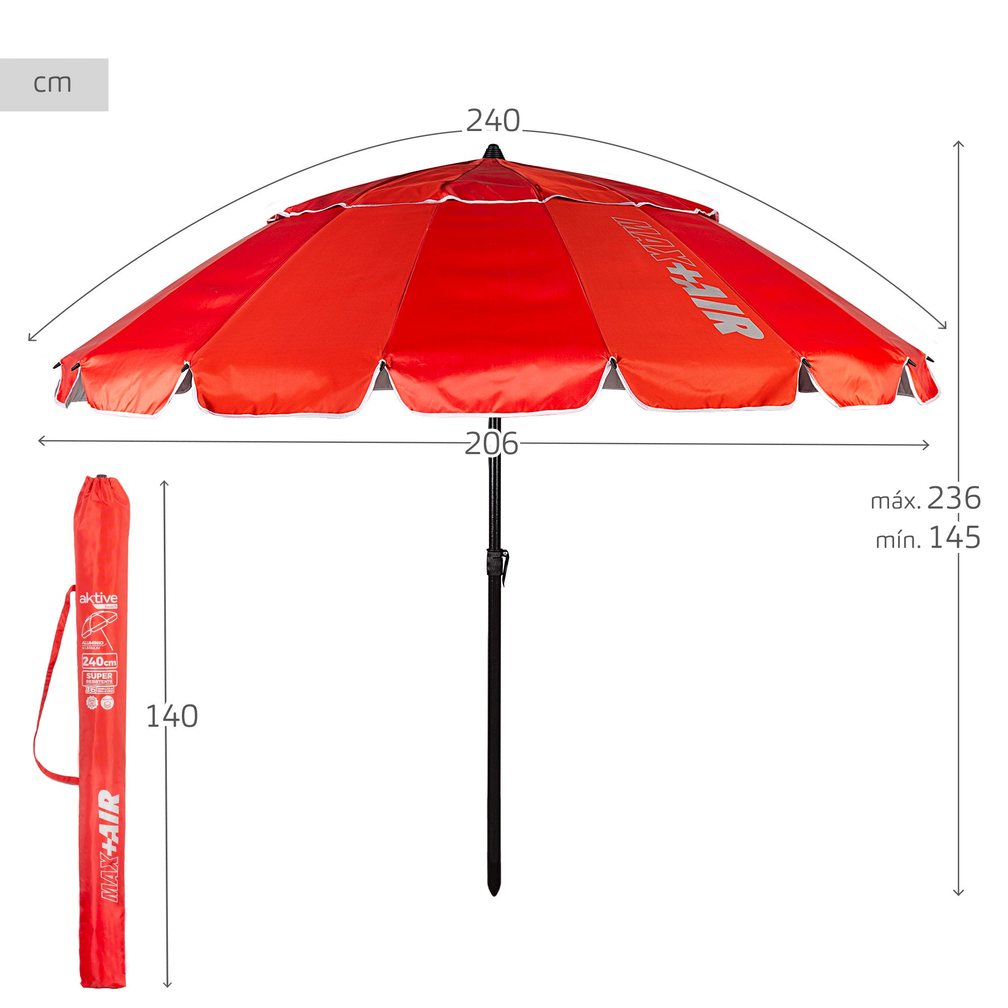 Guarda-chuva de praia à prova de vento de alta qualidade Max Air Aktive Beach. É de cor vermelha e mede Ø206x145/236 cm. É feito de tecido de poliéster de alta qualidade e um poste de alumínio de alta resistência Ø29/32 mm, ajustável em altura e ajustável de acordo com a posição do sol. Incorpora uma chaminé de ventilação que favorece a circulação do ar no seu interior e uma estrutura de 16 hastes flexíveis em fibra de vidro para maior resistência aos ventos fortes. Além disso, seu revestimento interno prateado ajuda a reduzir a temperatura sob o guarda-sol e sua proteção UV50 garante maior proteção contra os raios solares. O guarda-sol vem com uma bolsa com alça de ombro para fácil armazenamento e transporte.