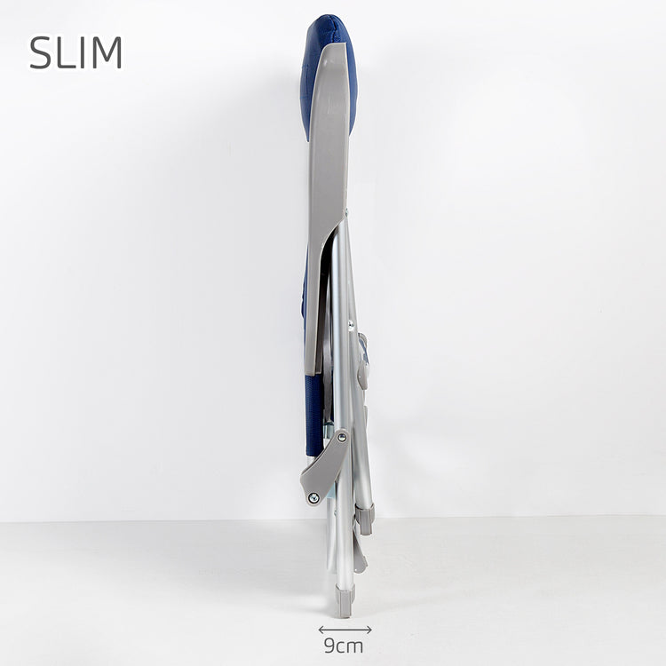 Esta cadeira de praia Aktive Beach foi projetada para relaxar por horas na praia e ocupa um espaço mínimo quando dobrada, já que sua principal característica é a dobra Slim. É fabricada com estrutura em alumínio prateado (suporta até 110kg), seu tecido é em textilene azul marinho reforçado e os apoios de braços ergonômicos são em plástico resistente cinza. A cadeira oferece grande conforto e funcionalidade graças à sua almofada acolchoada, ao encosto multiposições fácil de ajustar com os apoios de braços (6 posições), à ausência de um tubo dianteiro para as pernas e à mesa removível localizada sob o assento. As pernas possuem batentes anti-inclinação embutidos para maior estabilidade e segurança durante o uso e possui costuras seladas a quente no dorso e no assento para maior resistência e durabilidade. Graças à sua dobra extraplana, ao seu peso leve e às pegas incorporadas, é muito fácil de transportar, guardar e empilhar.
