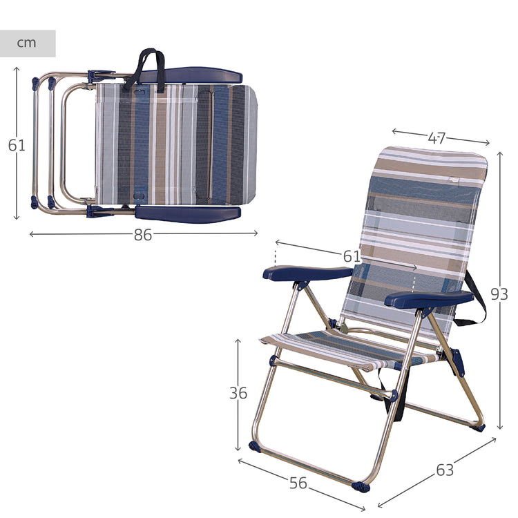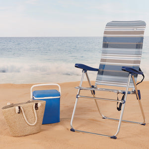 Fique confortável quando for à praia com esta cadeira alta dobrável e reclinável Aktive Beach com design listrado azul e cinza