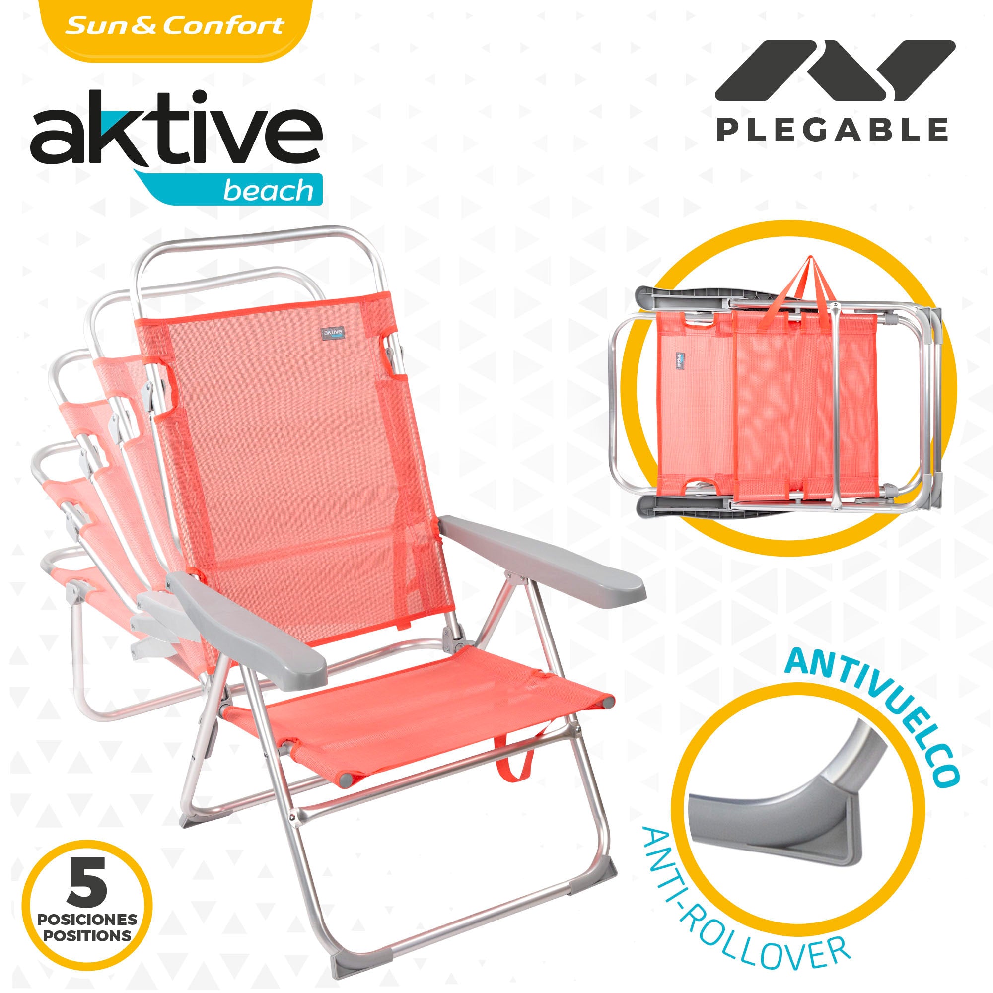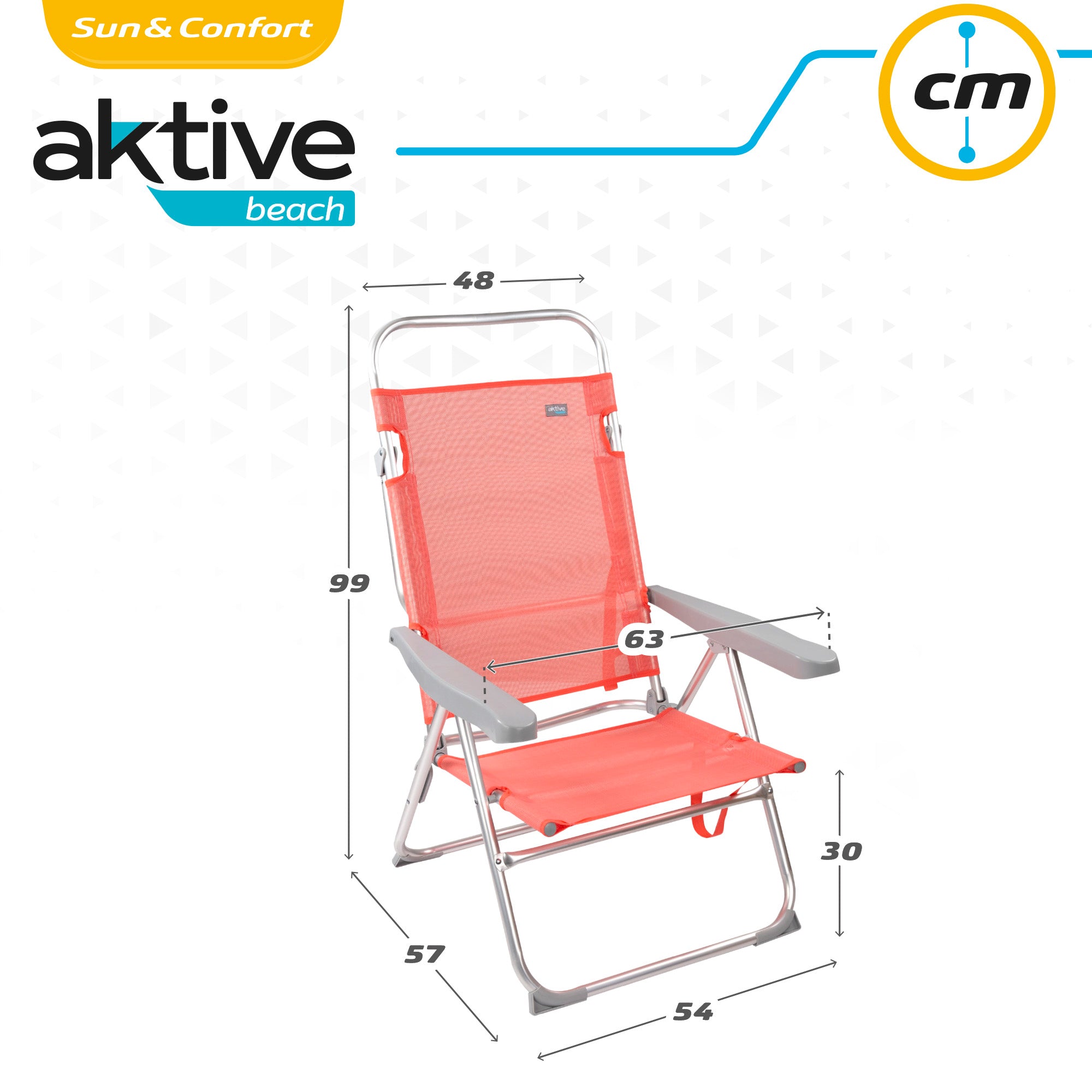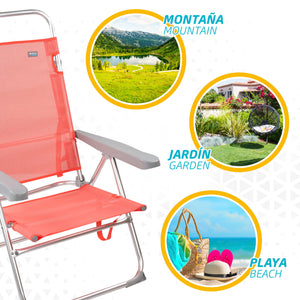 Cadeira dobrável baixa com encosto reclinável em 5 posições ajustáveis ??com braços ergonômicos. Feito com uma estrutura de alumínio resistente e assento em textilene, mede 48 x 57 x 99 cm, com pinos anti-queda para colocá-lo em qualquer superfície e manter a estabilidade. A altura do assento é de 30 cm e a distância entre os braços é de 63 cm. Inclui uma alça de transporte e, com seu peso leve, você pode transportá-lo para qualquer lugar. A cadeira dobrada mede 87 x 63 cm. Suporta um peso máximo de 100 kg.