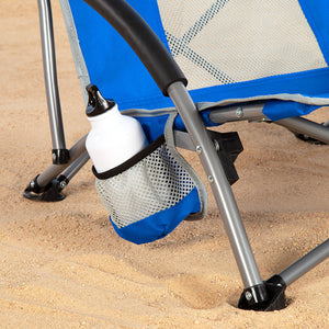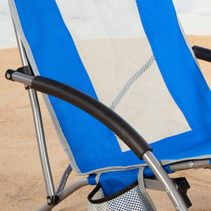 Cadeira de praia dobrável prática projetada com tecido de poliéster azul resistente e durável com encosto respirável com tecido de malha. A cadeira desdobrada mede 50x51x67 cm, a altura do assento é de 20 cm e a distância entre os braços é de 55 cm. Sua estrutura é feita de aço com capacidade de carga de 110 kg. O sistema dobrável é compacto e leve, ideal para levar com você todos os dias na praia. A cadeira dobrada mede 16x76 cm. Inclui bolso para guardar itens pessoais.