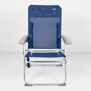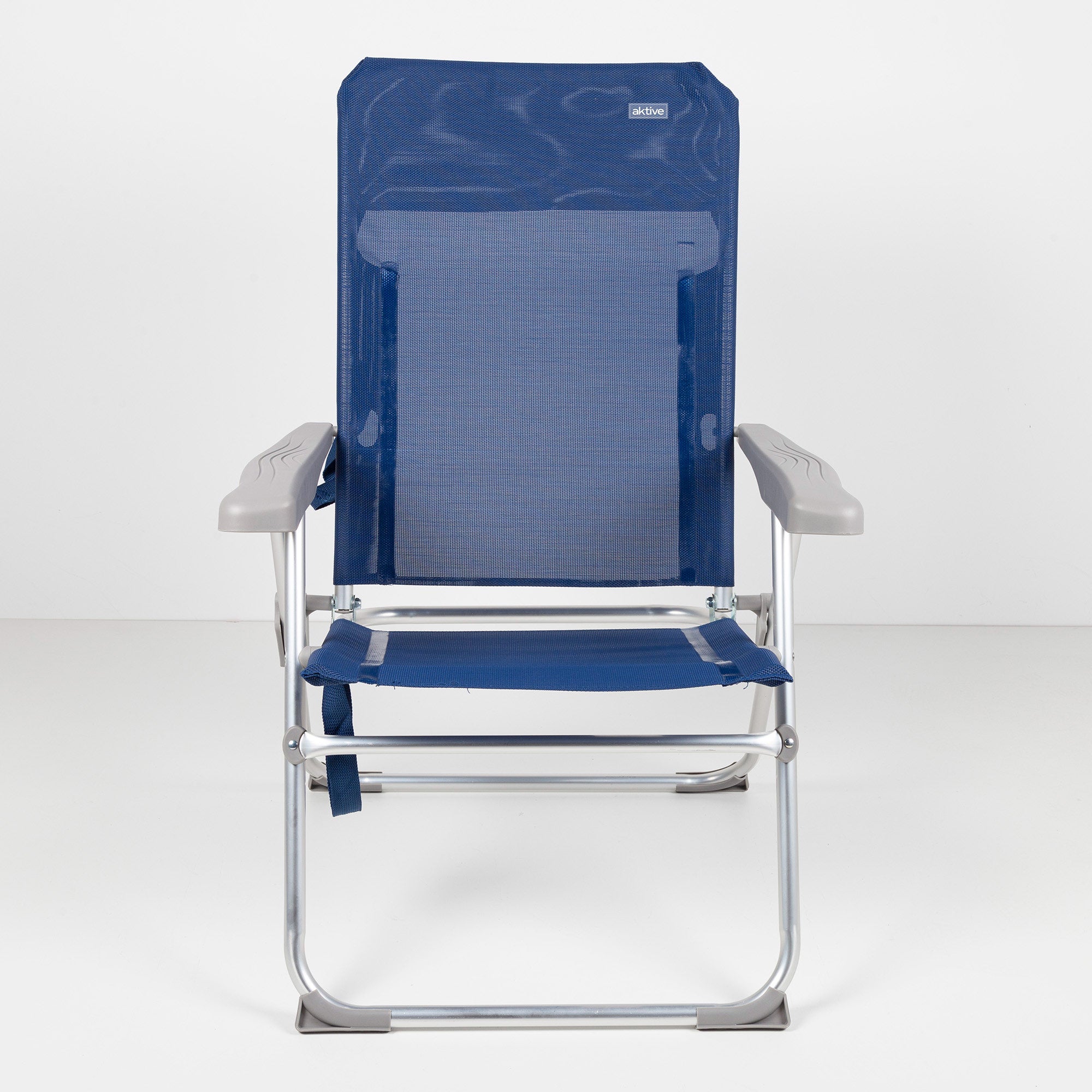 Esta cadeira de praia Aktive Beach foi projetada para relaxar por horas na praia e ocupa um espaço mínimo quando dobrada, já que sua principal característica é a dobra Slim. É feita com estrutura de alumínio prateado (suporta até 110 kg), seu tecido é em textilene azul marinho reforçado e os apoios de braços ergonômicos são em plástico resistente cinza. A cadeira oferece grande conforto graças ao encosto multiposições fácil de ajustar com os apoios de braços (6 posições) e à ausência de tubo dianteiro para as pernas. As pernas possuem batentes anti-inclinação embutidos para maior estabilidade e segurança durante o uso e possui costuras seladas a quente no dorso e no assento para maior resistência e durabilidade. Graças à sua dobra extraplana, ao seu peso leve e às pegas incorporadas, é muito fácil de transportar, guardar e empilhar.