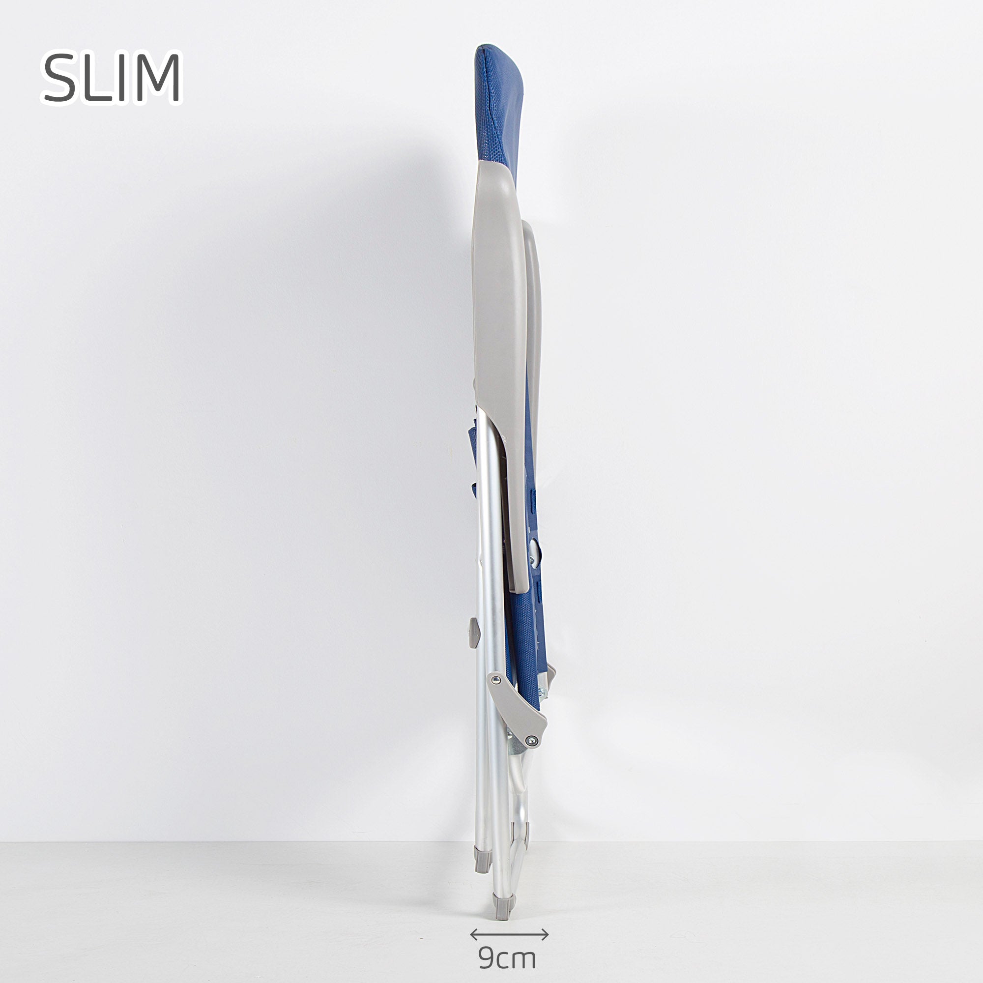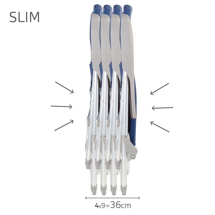 Esta cadeira de praia Aktive Beach foi projetada para relaxar por horas na praia e ocupa um espaço mínimo quando dobrada, já que sua principal característica é a dobra Slim. É feita com estrutura de alumínio prateado (suporta até 110 kg), seu tecido é em textilene azul marinho reforçado e os apoios de braços ergonômicos são em plástico resistente cinza. A cadeira oferece grande conforto graças ao encosto multiposições fácil de ajustar com os apoios de braços (6 posições) e à ausência de tubo dianteiro para as pernas. As pernas possuem batentes anti-inclinação embutidos para maior estabilidade e segurança durante o uso e possui costuras seladas a quente no dorso e no assento para maior resistência e durabilidade. Graças à sua dobra extraplana, ao seu peso leve e às pegas incorporadas, é muito fácil de transportar, guardar e empilhar.