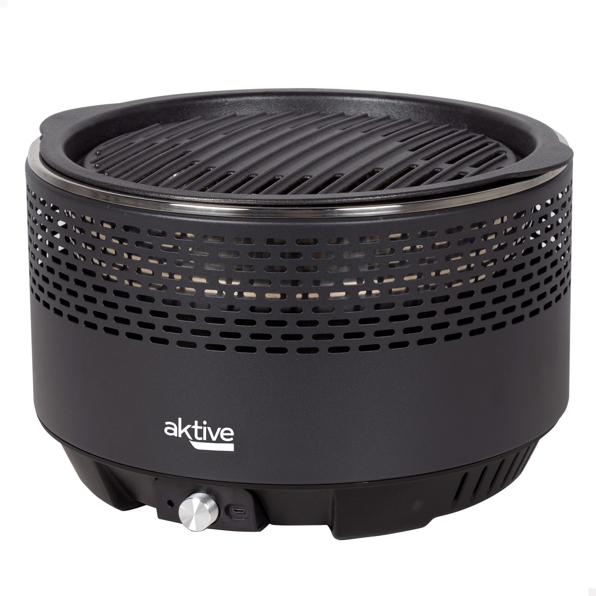 Churrasqueira de mesa com baixa emissão de fumaça Aktive Barbecue. É de cor preta e feito de aço inoxidável. Inclui grelha de ferro removível, recipiente removível com grelha para colocar o carvão e base removível para as cinzas. Possui um botão para regular a temperatura e um eficiente sistema de ventilação que funciona com baterias ou através de um cabo USB (não incluído) para obter baixa emissão de fumaça durante o cozimento dos alimentos na grelha. Permite cozinhar os alimentos de duas formas diferentes: assar na churrasqueira ou na grelha. Tem um tamanho pequeno e manejável e inclui uma bolsa de transporte e armazenamento com alças para facilitar o transporte. Perfeito para churrascos na varanda ou para levar a um piquenique. É aconselhável instalar em uma superfície nivelada, estável e resistente ao calor. Muito fácil de usar e limpar graças aos seus acessórios removíveis.