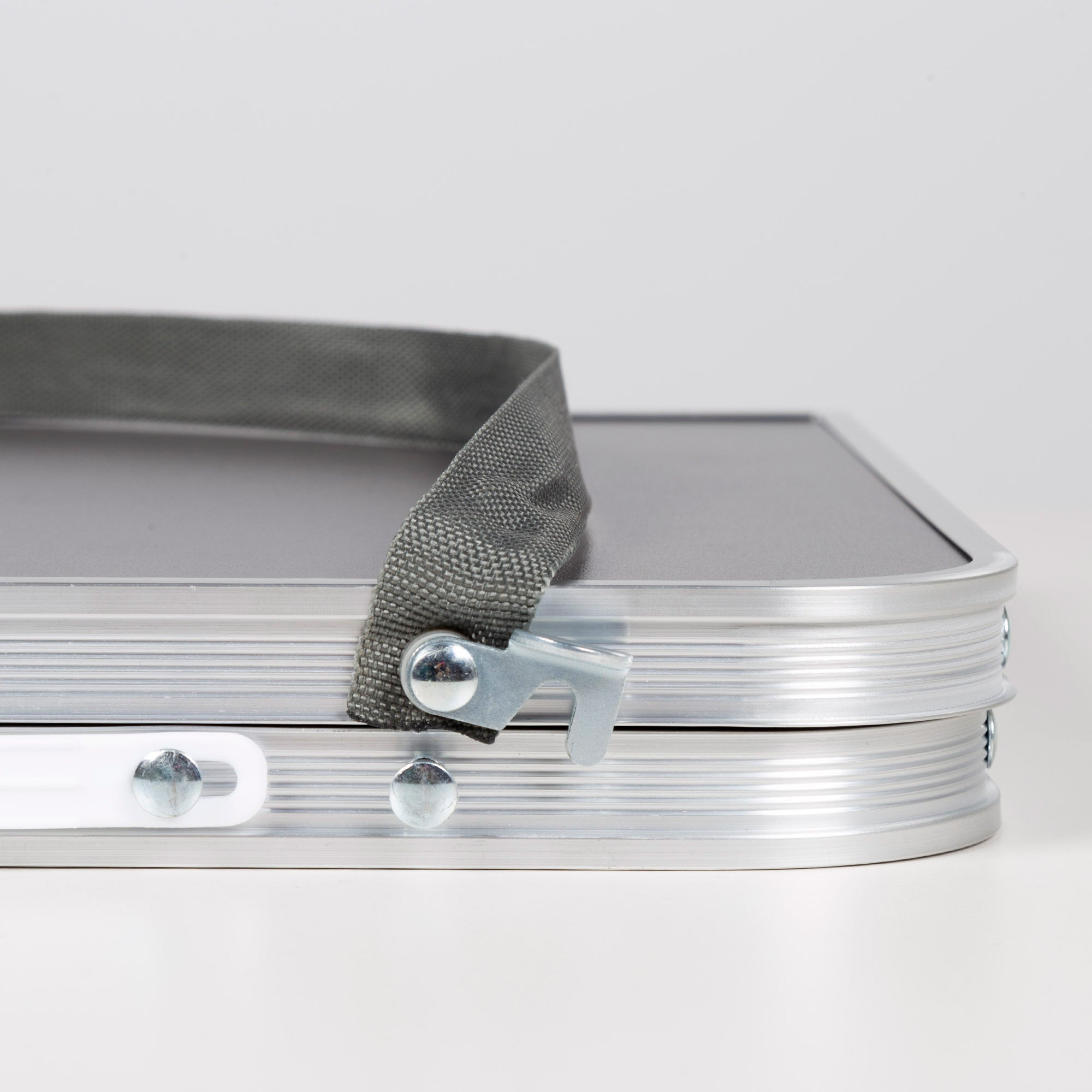 Melhore as suas escapadelas ao ar livre com esta mesa dobrável Aktive Camping! É fabricado com estrutura em alumínio e tampo madeira MDF antracite. Uma mesa elegante e funcional que ocupa 40x30 cm quando dobrada e que pode transportar confortavelmente para todo o lado em formato de pasta ou pendurada ao ombro sem ocupar muito espaço. É como carregar uma sacola! Além disso, possui um sistema de travamento de segurança integrado para evitar que seja aberto acidentalmente durante a viagem. Ideal para atividades ao ar livre, como piqueniques, churrascos ou camping.
