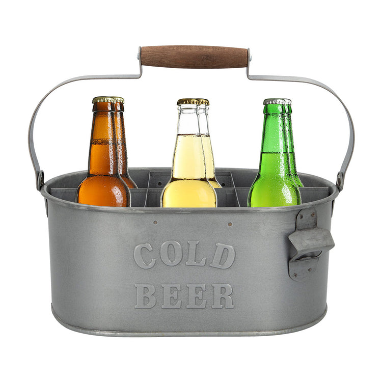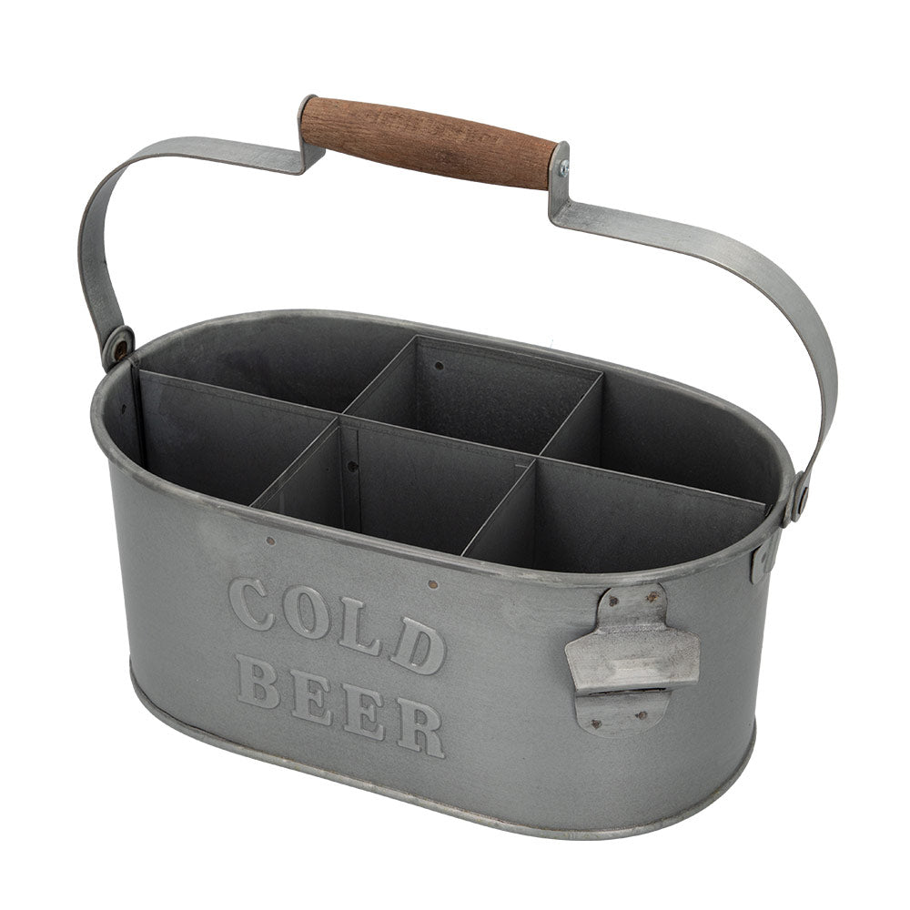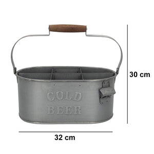 Porta-bebidas Aktive para 6 garrafas. Inclui abridor e 1 asa grande com reforço de madeira para transportar comodamente. É de cor prata e de forma oval. Medidas de 35,5x19,5x30 cm e interior com 6 separações para colocar as bebidas. Está fabricado com aço galvanizado de efeito envelhecido, resistente a oxidação, humidade e água. Ideal para terraço e jardim.