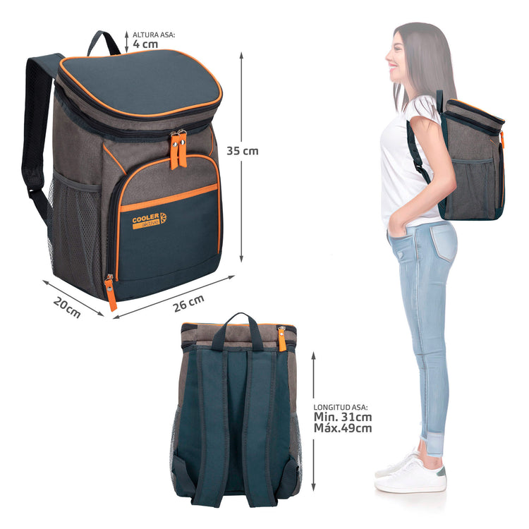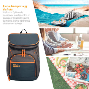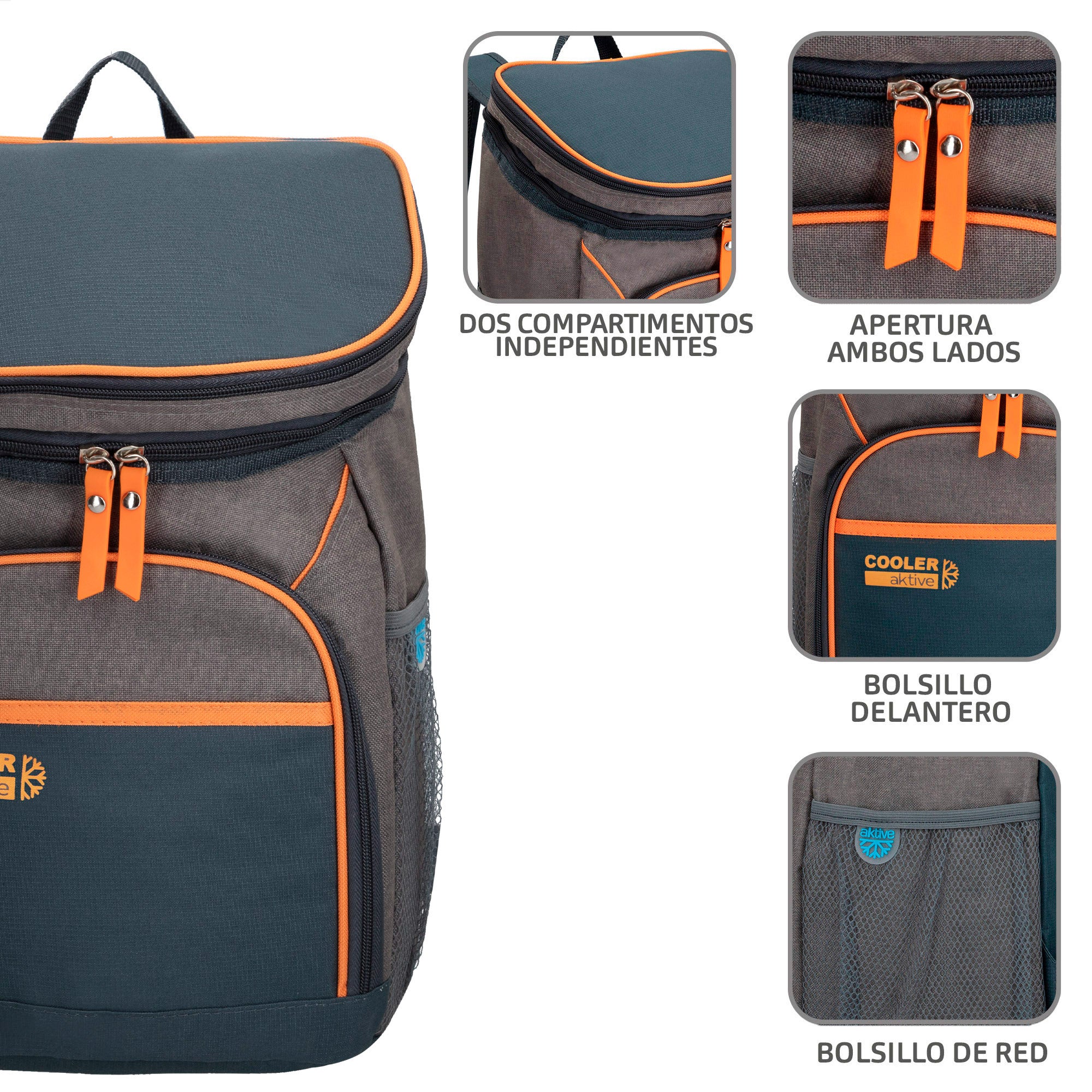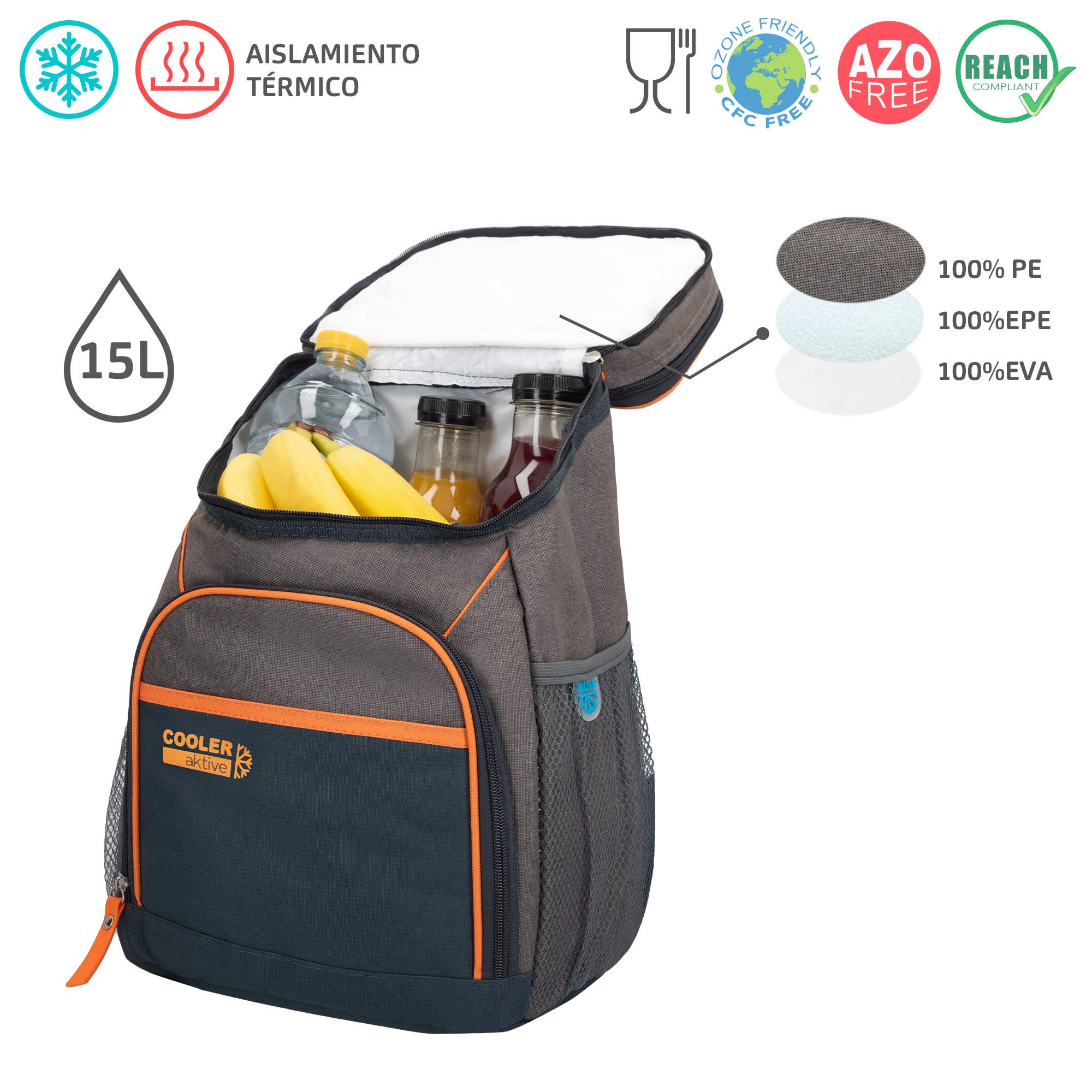 Refrigerador portátil em formato de mochila com capacidade para 15 litros. Ideal para transportar alimentos e bebidas e manter sua temperatura por mais tempo (quente e frio). Design elegante em cinza escuro, preto e laranja com medidas de 26x20x39cm, alças ajustáveis e 5 bolsos (2 malhas, 2 térmicas pequenas e 1 térmica grande). Fabricado em poliéster com forro impermeável e isolamento em PVC. Bolsas térmicas Aktive Cooler: Geleira portátil em formato mochila, medidas 26x20x39 cm, capacidade: 15 litros Alta capacidade com 5 bolsos: 1 superior e 1 frontal para utensílios e outros objetos, 2 laterais de rede e 1 geleira de fecho hermético de fecho éclair duplo Elegante e prática: Desenho simples e clássico em cinza e laranja, de 2 asas ajustáveis para utilizar como mochila e 1 asa pequena para pendurar Para qualquer ocasião ao ar livre: Uma solução versátil para levar alimentos e bebidas e manter a temperatura tanto fria como quente Impermeável e lavável: De revestimento interior de PVC que não permite deteriorar diante de acidentes com líquidos, se pode lavar à mão facilmente
