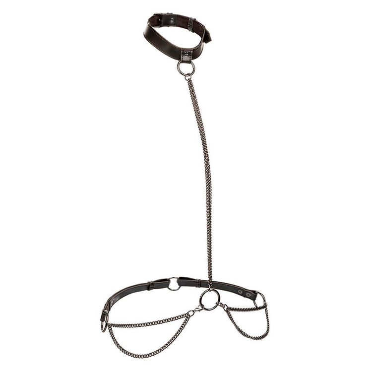 Cuidadosamente elaborado para curvas confiantes, este arnês premium transita perfeitamente do cabresto para a coleira e guia, celebrando todo o espectro de prazer.