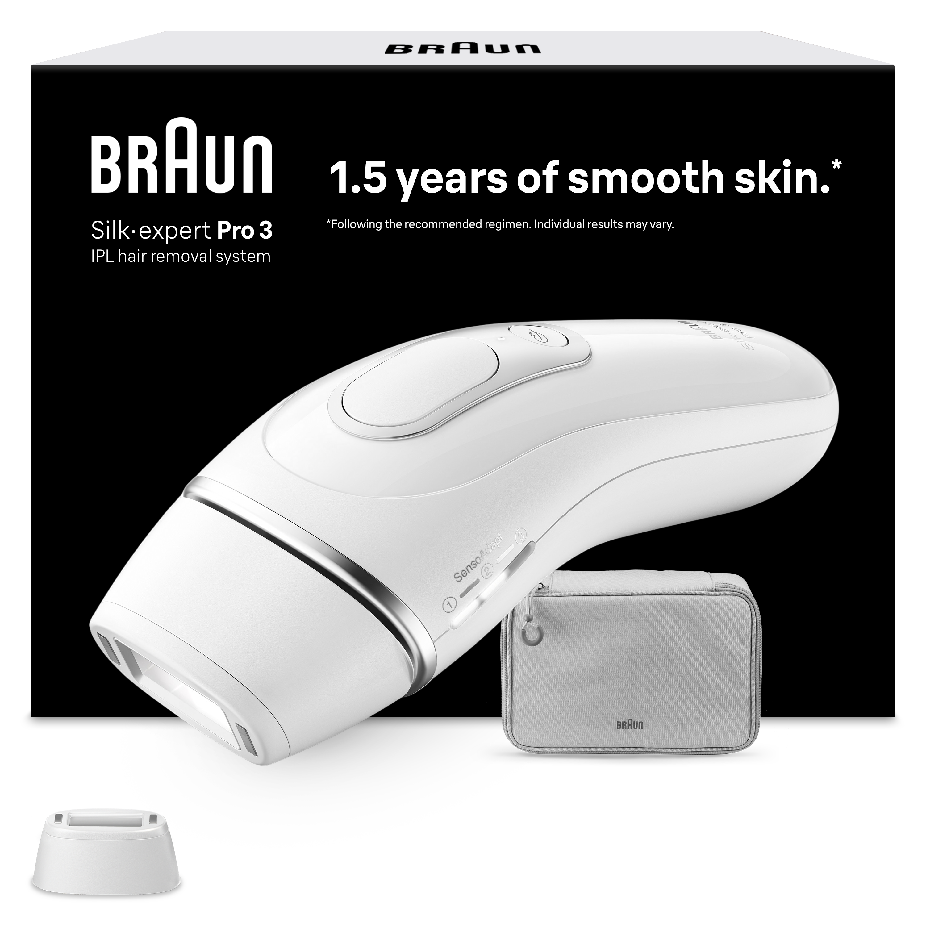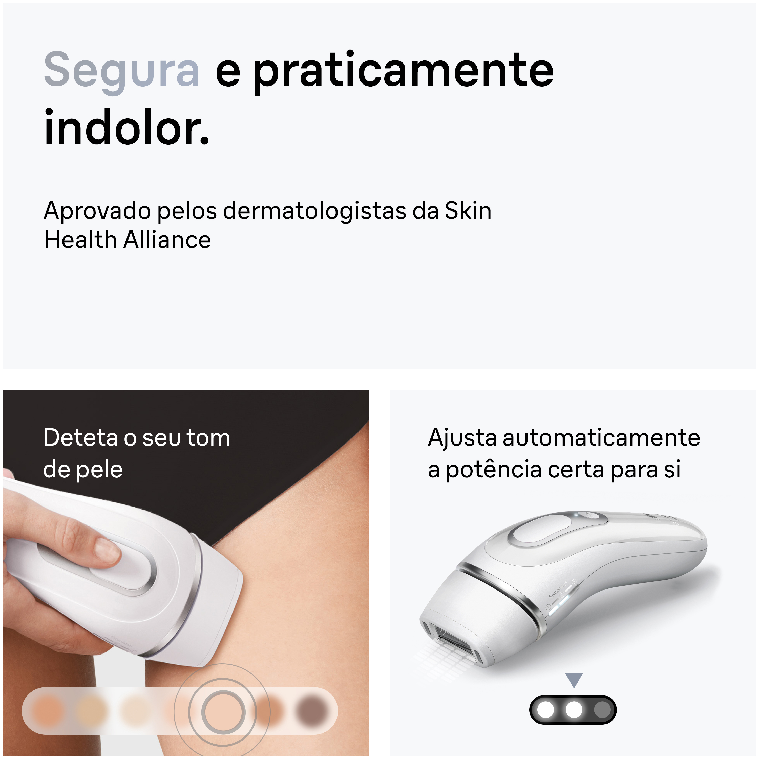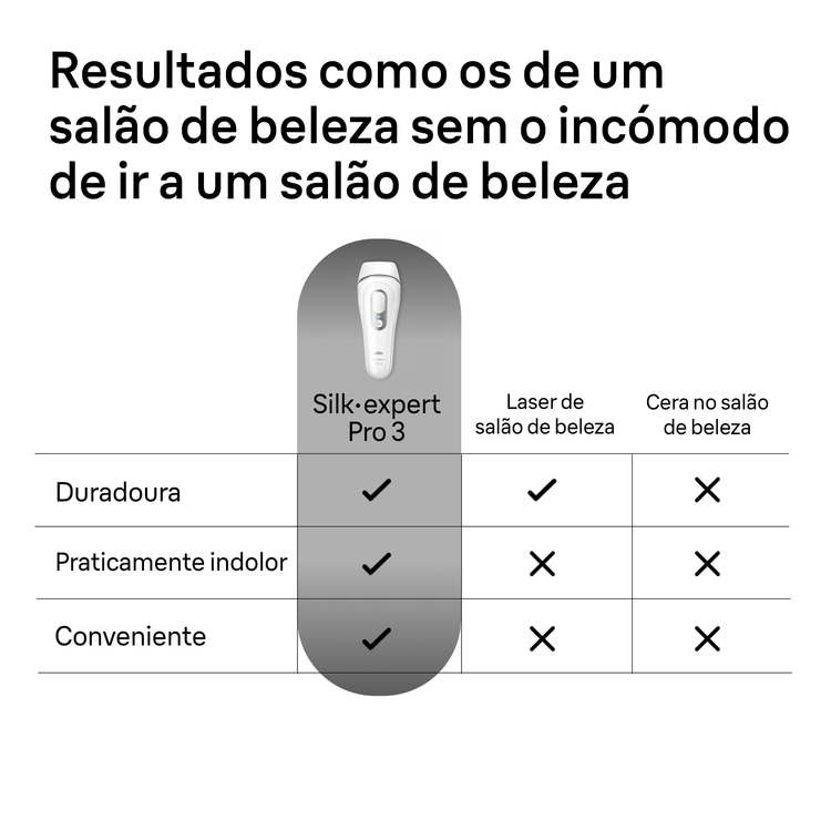 Redução permanente de pelos visíveis com Silk-expert Pro 3 PL3020 IPL da Braun. Rápido, preciso e suave. Características: Pele sempre suave graças à tecnologia Skin Pro (SensoAdapt™). O tom de pele varia ao longo do corpo, por isso o sensor Skin Pro (SensoAdapt™) (com filtro UV) identifica continuamente a sua pele e adapta automaticamente a potência de cada foto às diferentes áreas do seu corpo. Potente e suave. O sensor Skin Pro (SensoAdapt™) identifica continuamente seu tom de pele 80 vezes por segundo e ajusta automaticamente o nível de intensidade.