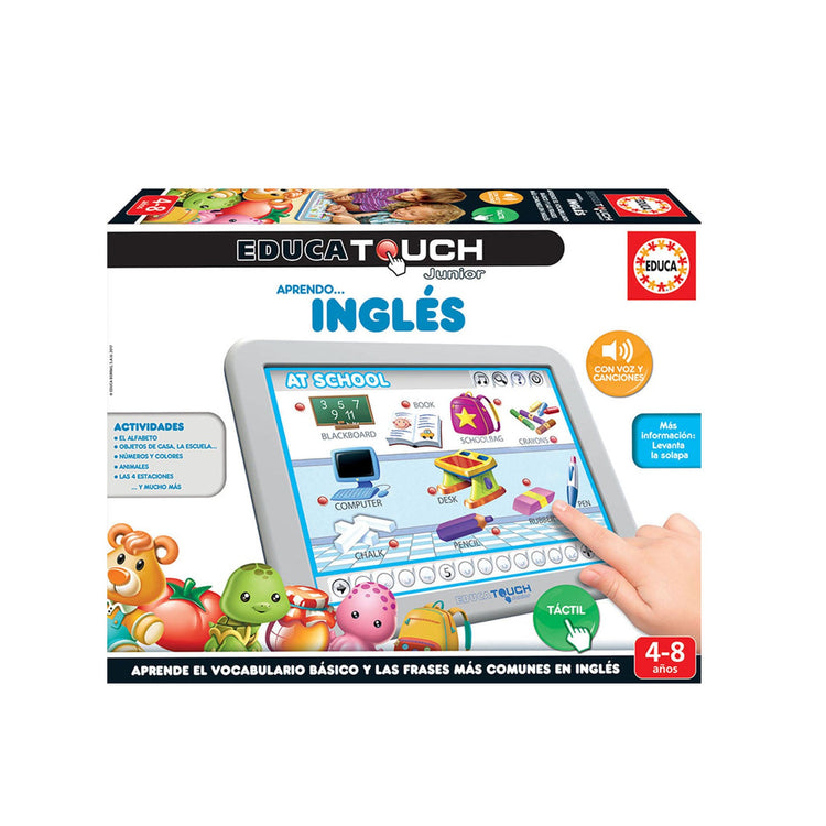 Aprende facilmente Inglês com o Educa Touch. CONTEÚDO: 1 base Educa Touch Junior. 6 lâminas de atividades (o alfabeto, os números, os animais, as cores, as 4 estações, objetos da casa, da escola e outros). Instruções: APRENDEM: O vocabulário básico em inglês e as frases mais comuns. IDIOMAS PACKAGING: ES/PORT/FR/ING
