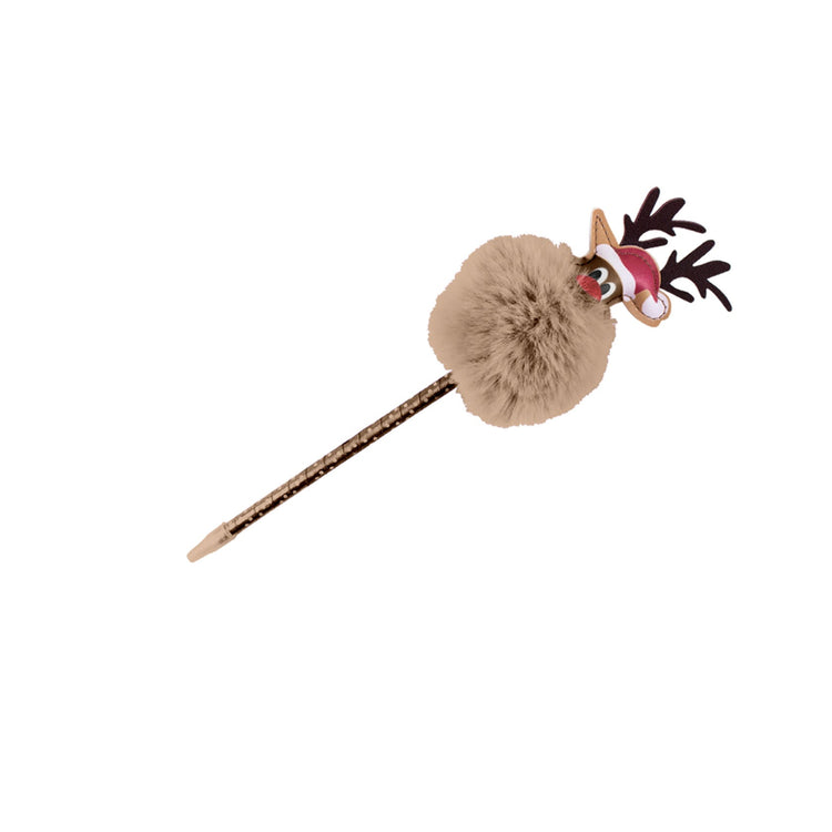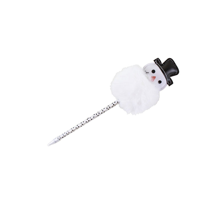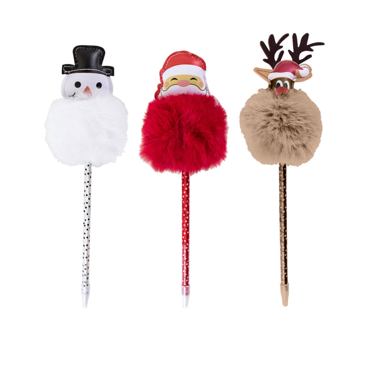 Canetas Pom Pom de Natal com aproximadamente 24 cm de comprimento e apresentam um personagem festivo anexado e um pompom fofo. Cada caneta de Natal tem tinta azul e contém uma tampa