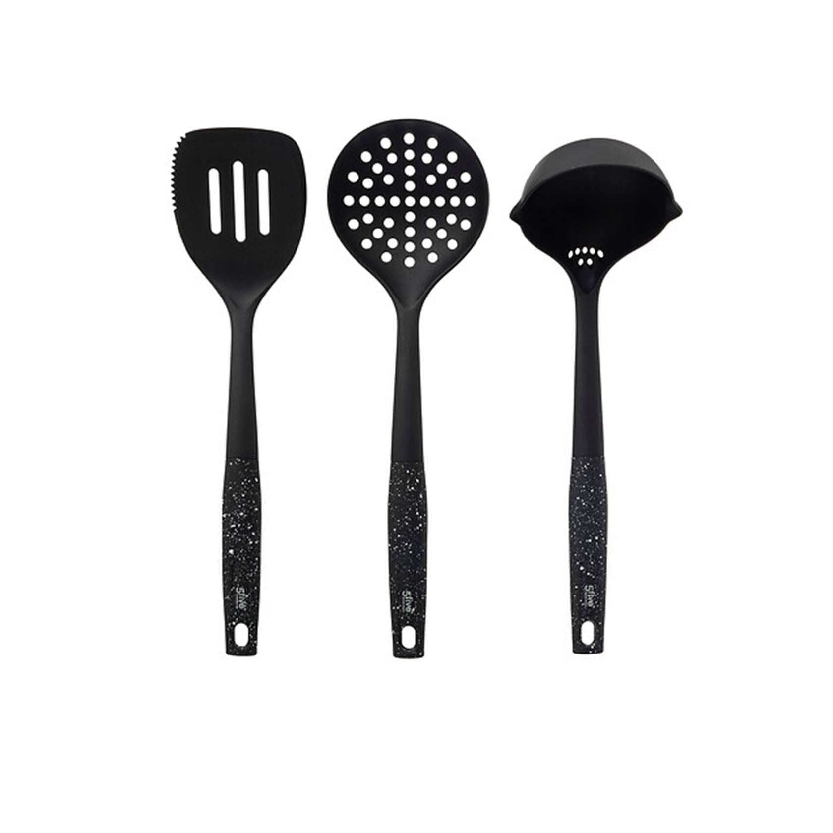Pack com colher, escumadeira e espátula em nylon resistente a 210 °C. Comprimento 33 cm; seguros para revestimentos antiaderentes.