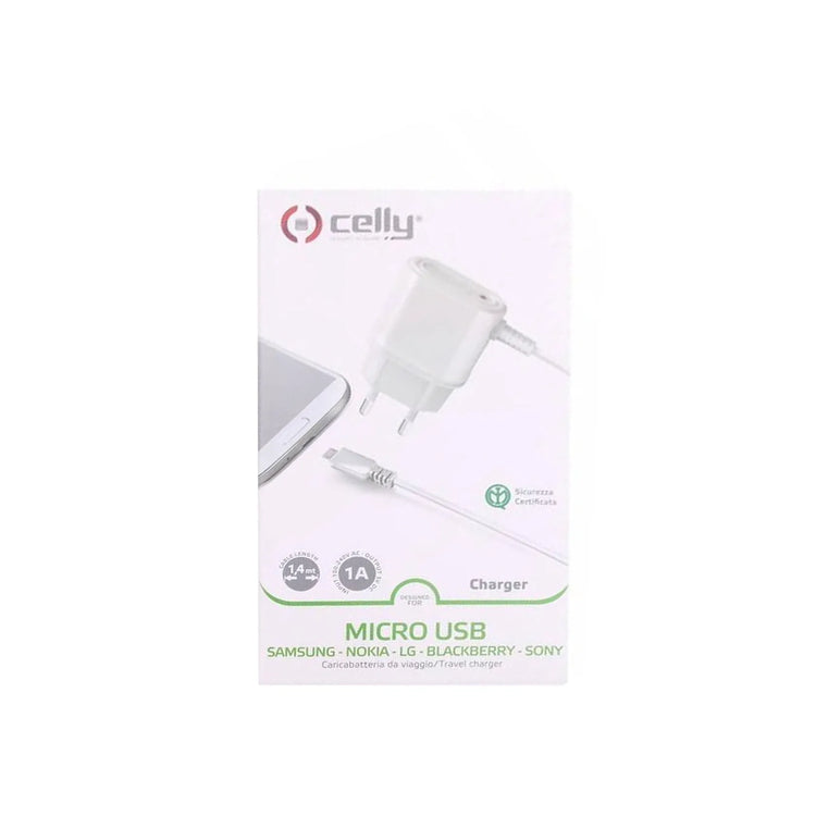 Carregador de viagem branco com conector MicroUSB, saída máxima 1A.
