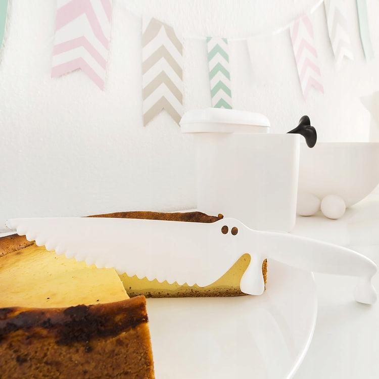 Uma faca para cortar massa Koziol alemã da coleção Coco. Surpreende com seu design incomum e original - sua forma lembra um crocodilo. Foi fabricado em plástico de alta qualidade, graças ao qual não risca a superfície da placa, é leve e confortável de usar. A faca também foi equipada com dentes afiados que lidam com a maior facilidade com qualquer tipo de massa. A faca pode ser colocada nas pernas do crocodilo, para não sujar o tampo da mesa. Também pode ser usado como uma espátula para servir pedaços de massa.