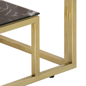 - Tampo de vidro com acabamento em mármore preto: o tampo da mesa de apoio ao sofá oferece uma superfície segura e ampla para colocar vasos, jarros ou outros artigos decorativos.