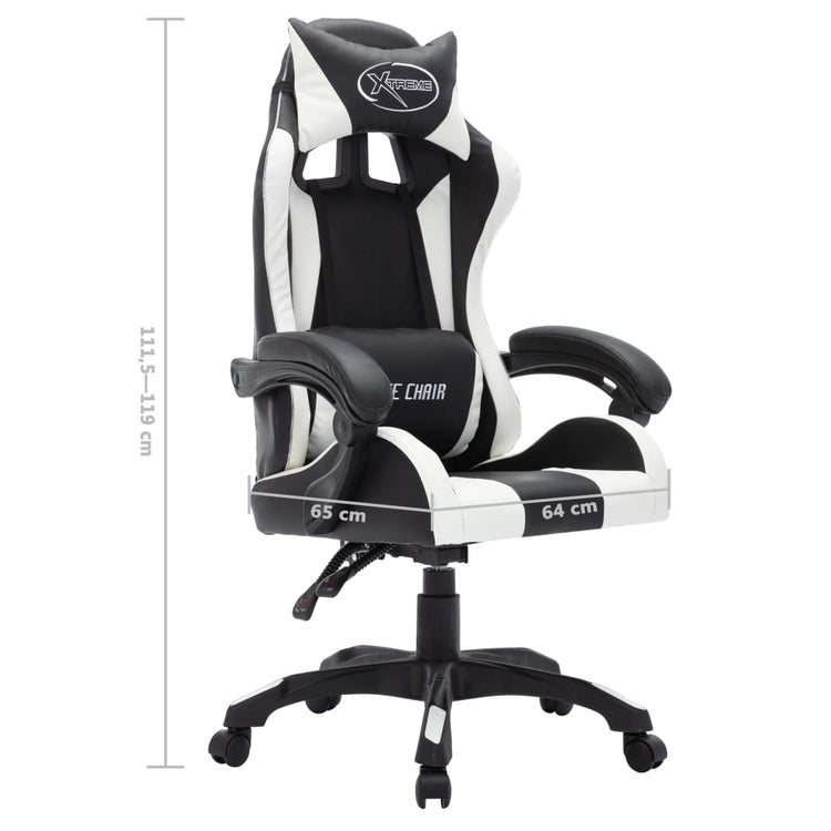 Esta cadeira de gaming foi estofada com couro artificial, tornando-a fácil de limpar. A almofada de cabeça espessamente acolchoada incluída e o almofadão de cintura fornecem conforto extra durante o seu movimentado dia de trabalho. Com o mecanismo de elevação a gás, esta cadeira de escritório é ajustável em altura. Também pode ajustá-la para uma posição reclinada, por conseguinte, se quiser tirar uma sesta, só tem de colocar o encosto numa posição totalmente reclinada. A rotação a 360 graus e o design com 5 rodas torna-a ainda fácil de deslocar. A extremidade do encosto está equipada com luzes LED, oferecendo-lhe uma melhor atmosfera enquanto joga. Pode alterar facilmente a cor e a intermitência das luzes através do comando remoto.