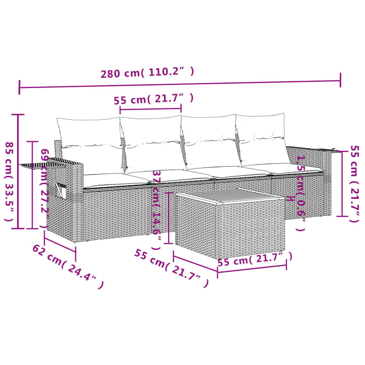 HKH 5 Pcs Conjunto Sofás de Jardim C/ Almofadões Vime Pe - Cinzento