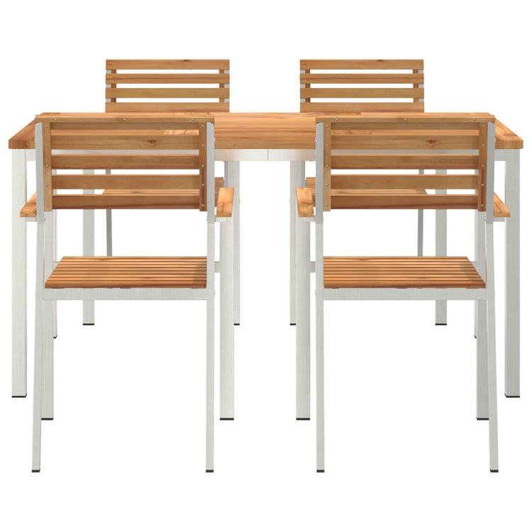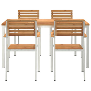 Este Conjunto de Jantar de Jardim de 5 Peças é feito de madeira de teca sólida, juntando estilo e utilidade para refeições ao ar livre. O design elegante com superfícies lisas e ripas estilizadas cria um espaço agradável para conviver, seja num pátio, varanda ou jardim.