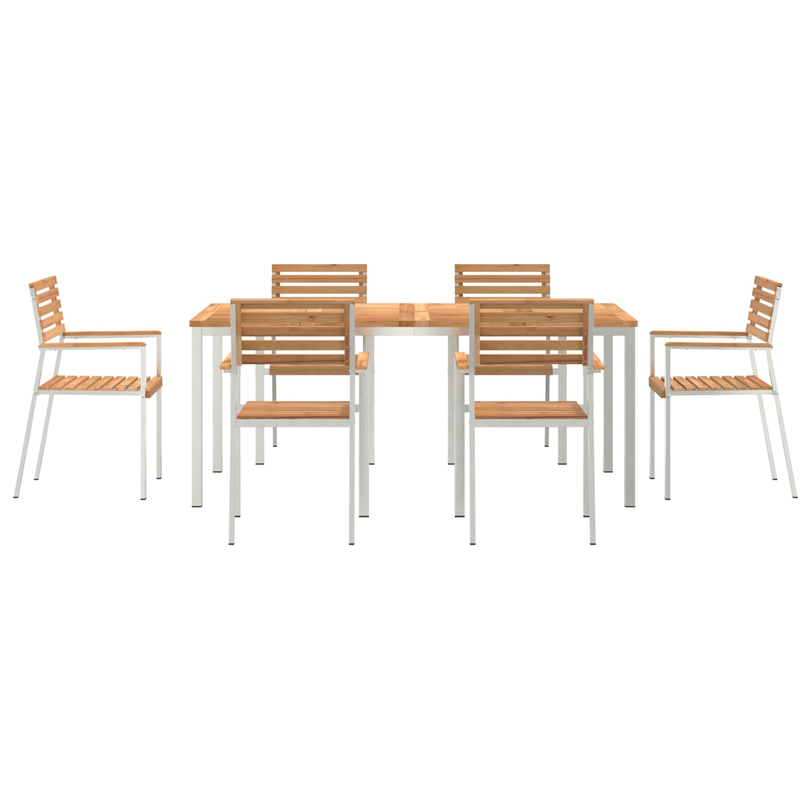 Este Conjunto de Jantar de Jardim de 7 Peças é feito de madeira de teca maciça, combinando estilo e funcionalidade para refeições ao ar livre. Com um design moderno e um tampo de mesa ripado, cria uma atmosfera acolhedora para encontros, seja no pátio, varanda ou jardim.