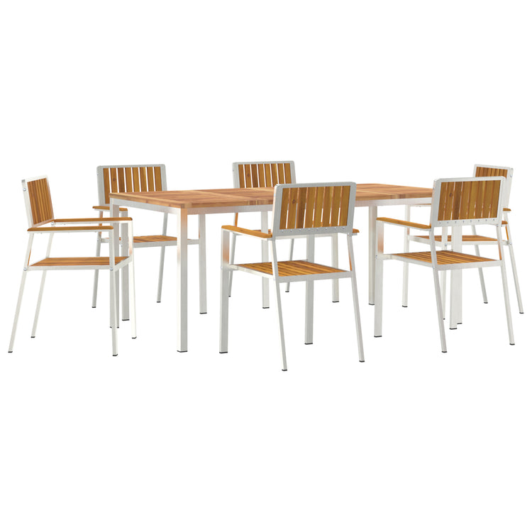 Este espaçoso conjunto de jantar para o jardim tem uma linda mesa retangular e seis cadeiras a combinar, feitas de madeira de acácia sólida. É ideal para entretenimento ao ar livre e cria um ambiente acolhedor para a família e amigos se reunirem e apreciarem refeições no jardim ou no pátio.