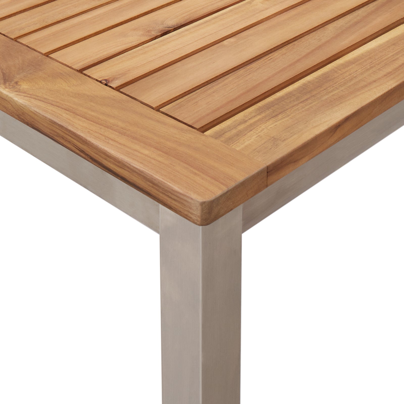- Construção Robusta: O tampo da mesa em ripas fixas e a estrutura de aço resistente à ferrugem garantem durabilidade, tornando este conjunto ideal para uso externo durante todo o ano.