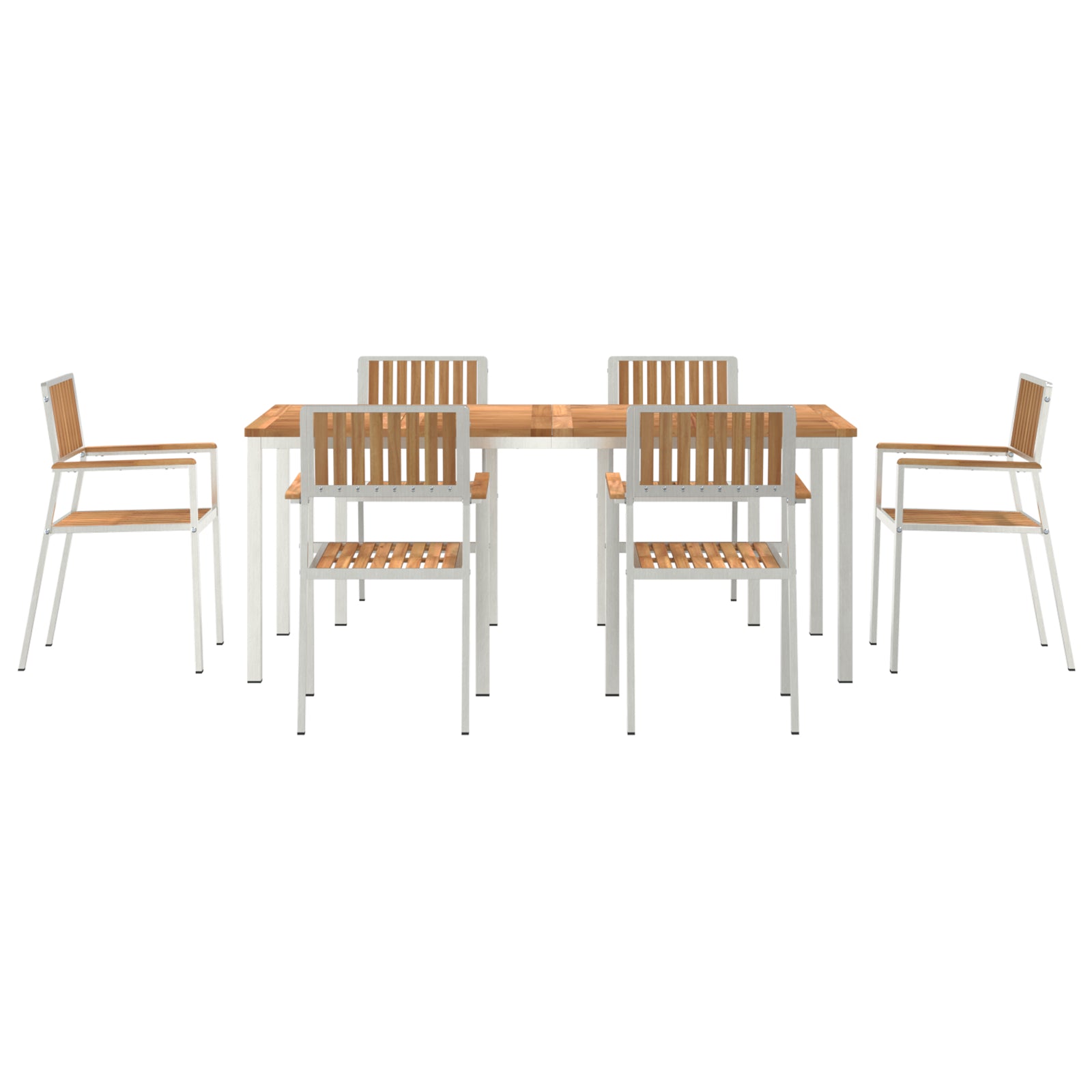 Este conjunto de jantar para o jardim reúne uma mesa retangular atraente e seis cadeiras combinadas, feitas em madeira de teca sólida. É a escolha certa para refeições ao ar livre, oferecendo bastante espaço para familiares e amigos desfrutarem de deliciosas refeições na varanda ou no pátio.