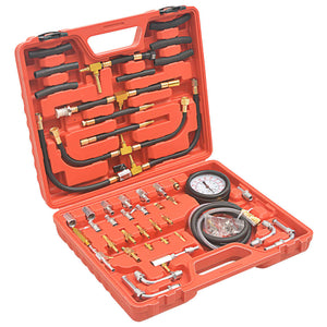 Este kit profissional para testar a pressão de injeção de combustível inclui adaptadores, mangueiras, braçadeiras e acessórios aplicáveis aos sistemas de injeção mecânica e eletrónica de gasolina na maioria dos carros e camiões de todo o mundo tais como BMW, GM, Ford, Toyota, Nissan e mais carros a gasolina.